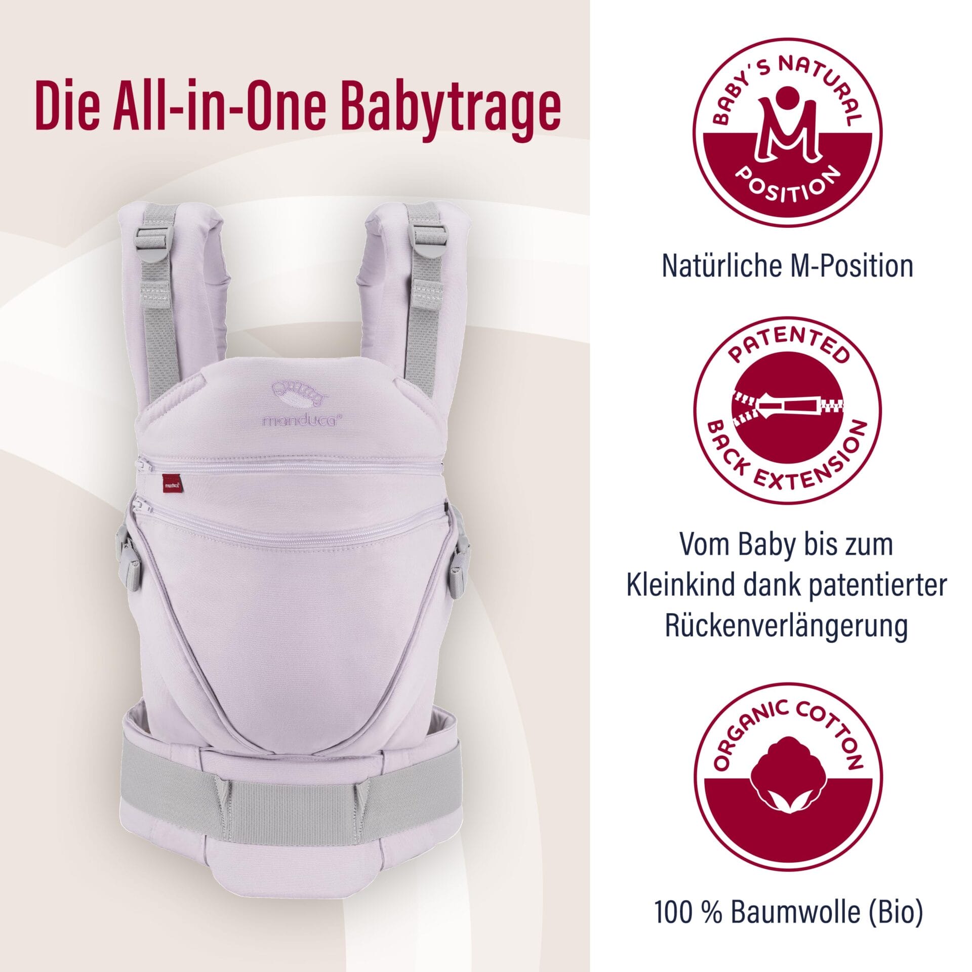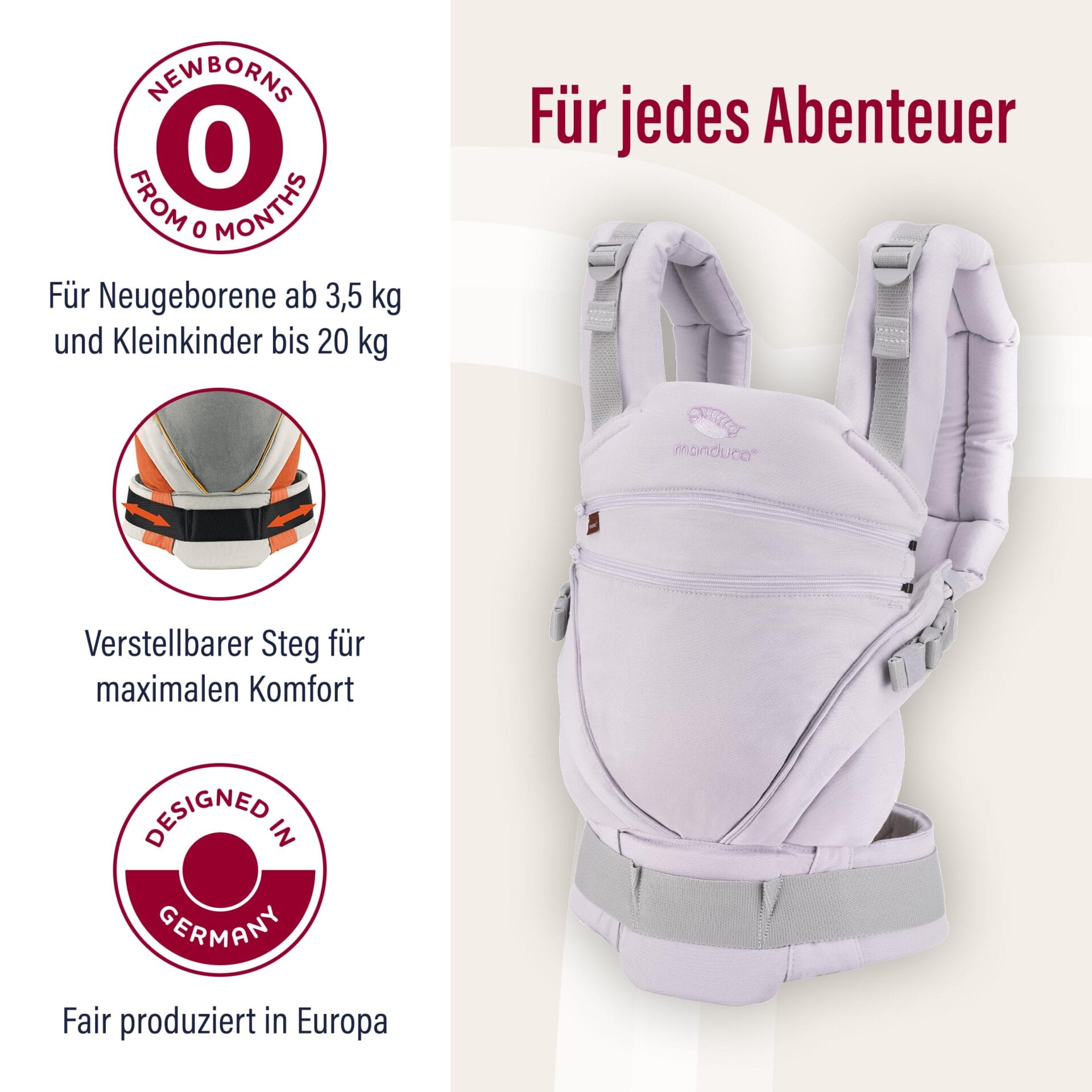 • Ergonomiczne nosidełko dla niemowląt – jako nosidełko na brzuch, biodra lub plecy, nosidełko utrzymuje noworodki od urodzenia bezpiecznie w swojej naturalnej, ortopedycznej prawidłowej pozycji M.