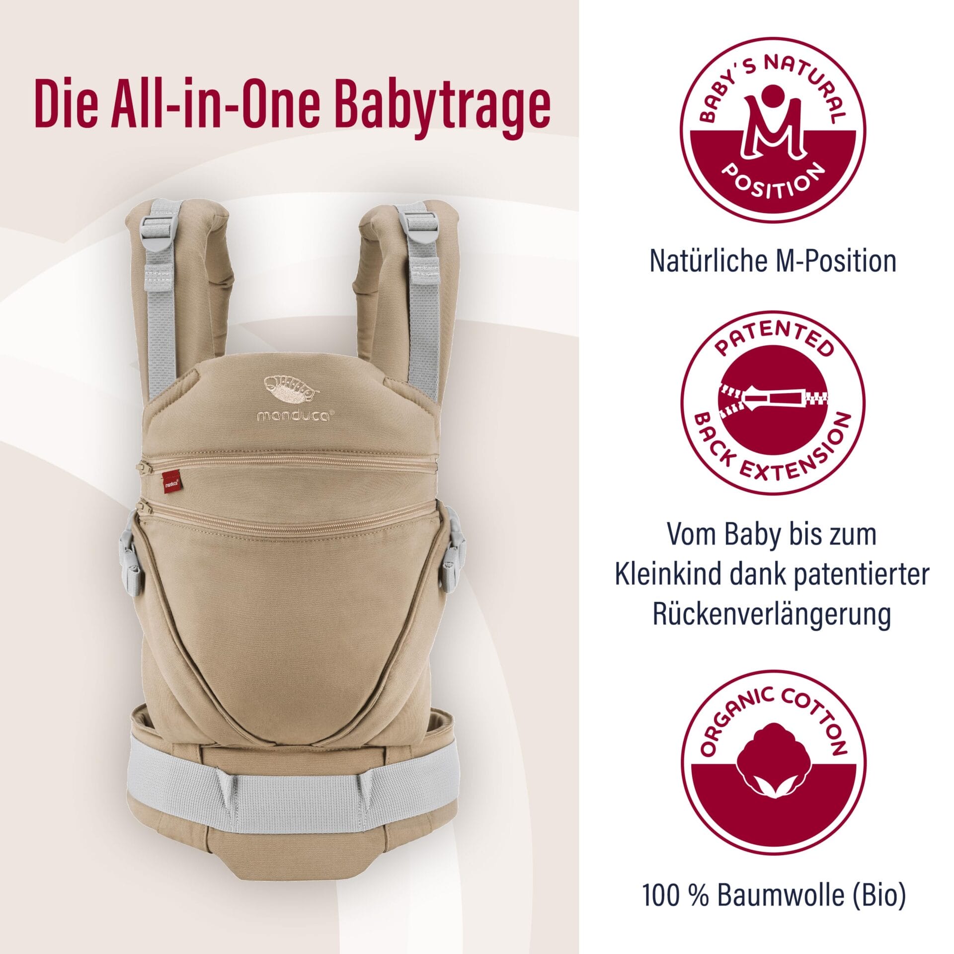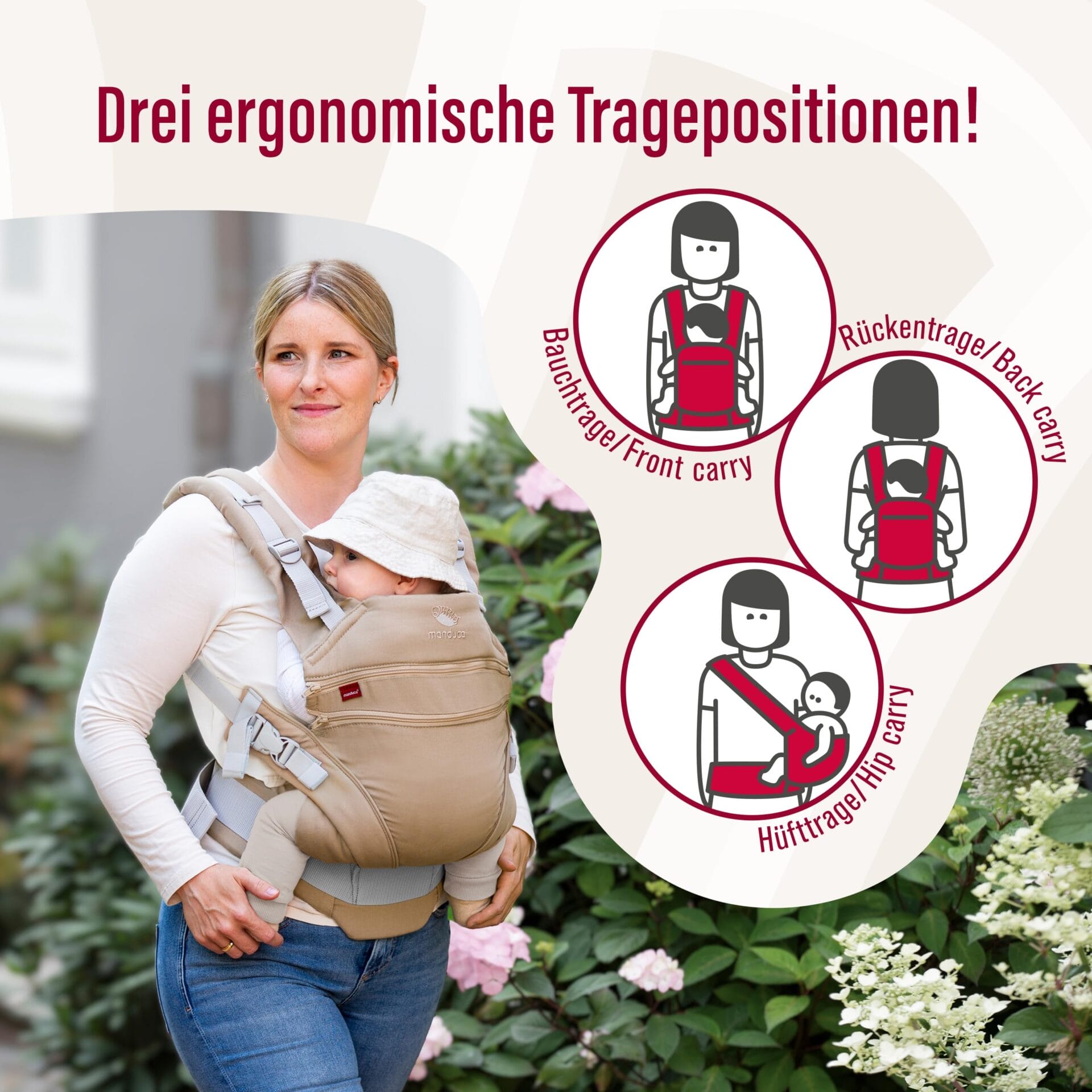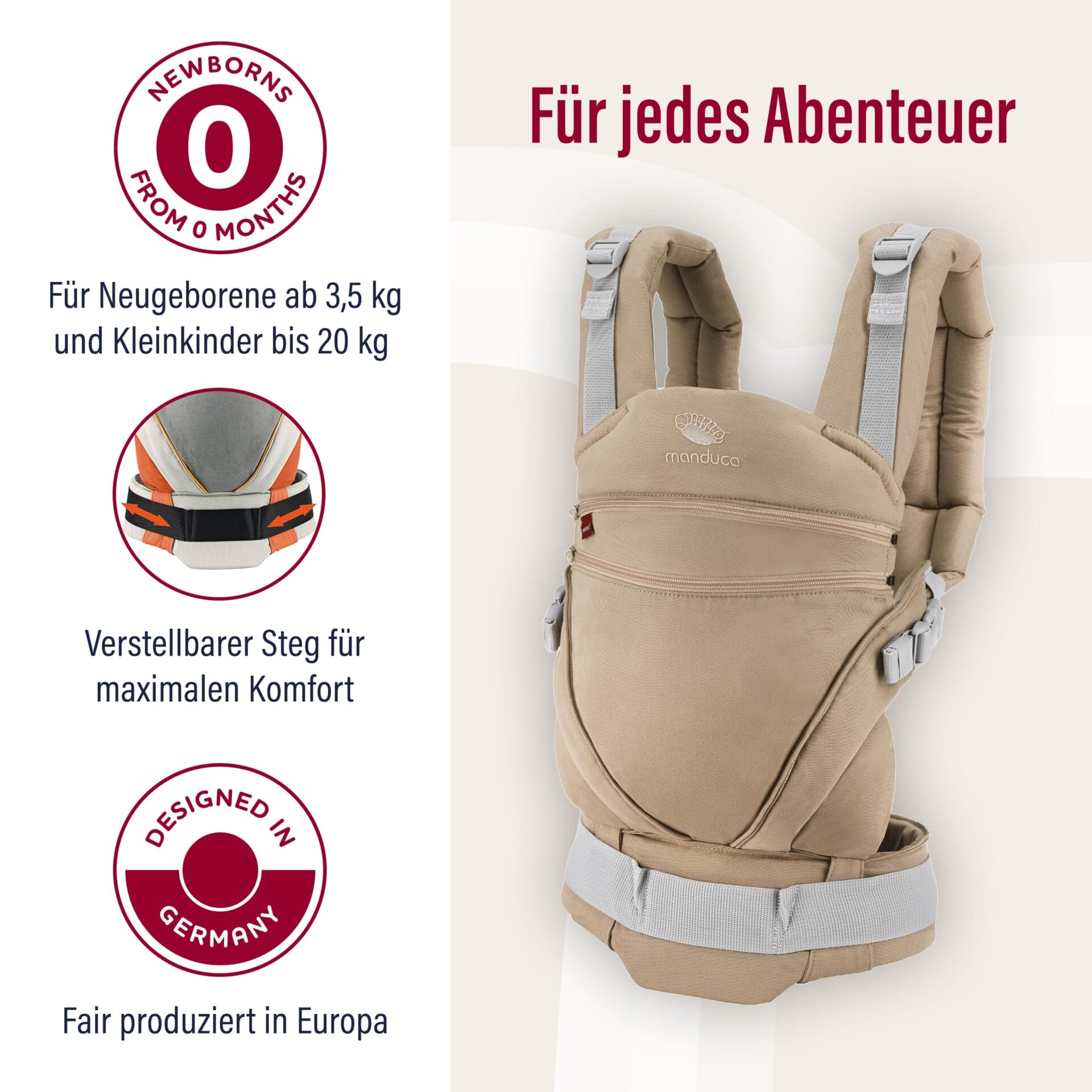 • Ergonomiczne nosidełko dla niemowląt – jako nosidełko na brzuch, biodra lub plecy, nosidełko utrzymuje noworodki od urodzenia bezpiecznie w swojej naturalnej, ortopedycznej prawidłowej pozycji M.