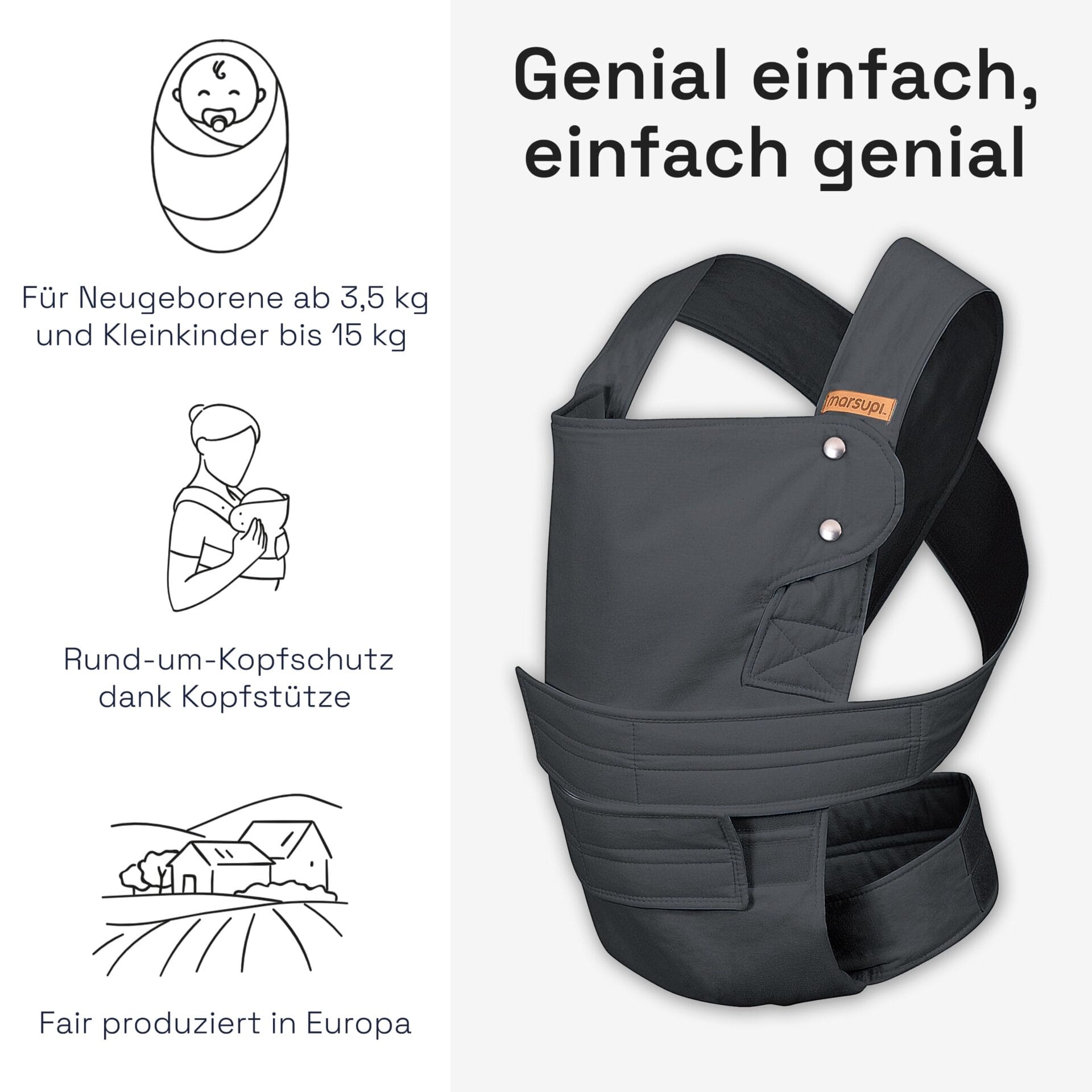 marsupi Klasyczne nosidełko dla niemowląt – dla noworodków od urodzenia do 15 kg – zamiennik – zapięcie na rzep – lekkie i kompaktowe – szare XXL