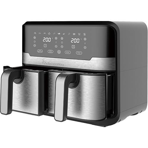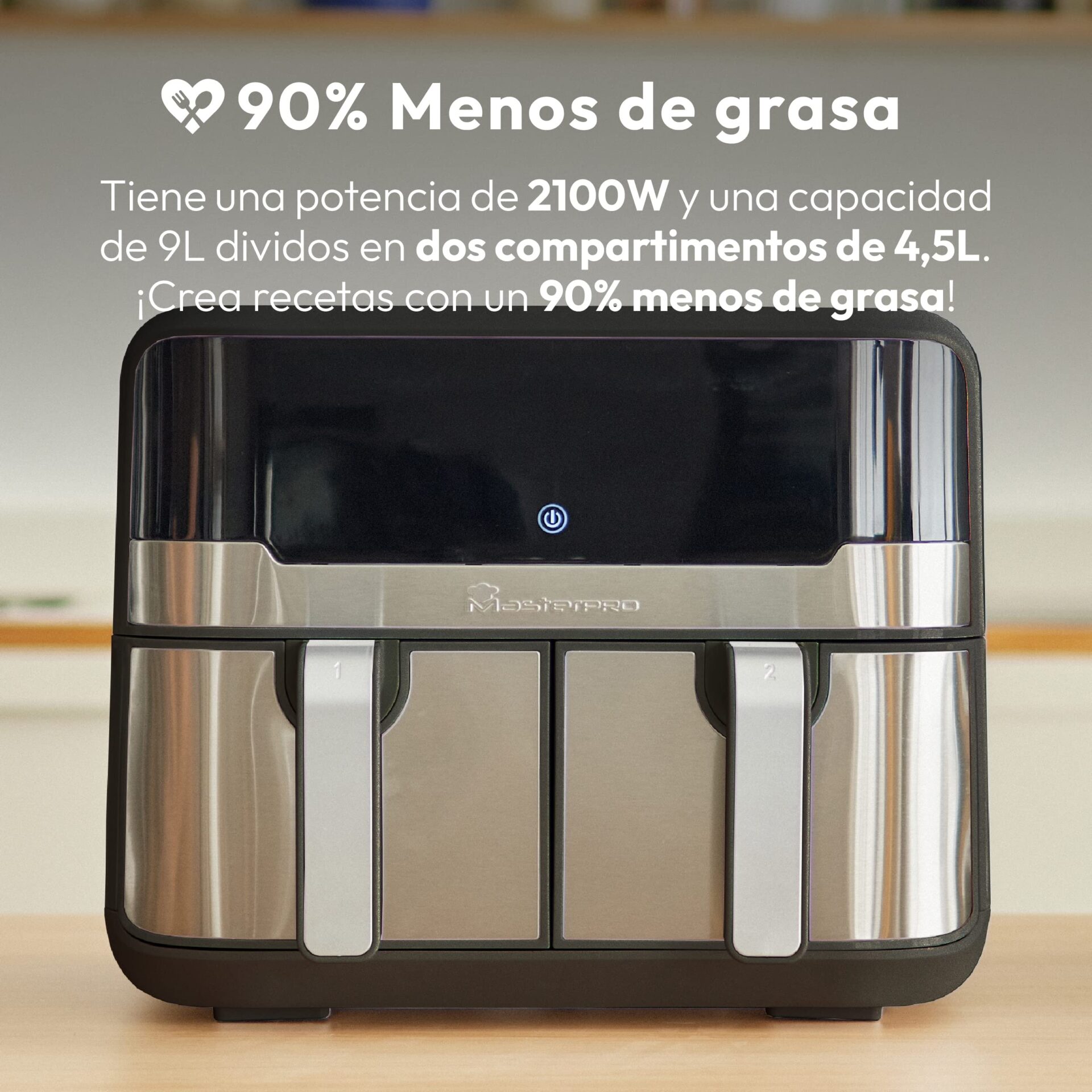 MasterPRO Rocket Duo 900 – Podwójna frytkownica bezolejowa – Kolor Czarny – Pojemność 9 l i 2400 W – Ekran Dotykowy LED i Nieprzywierający kosz + Prostokątna taca do pieczenia Silikon 12.7X19.5X7+2CM
