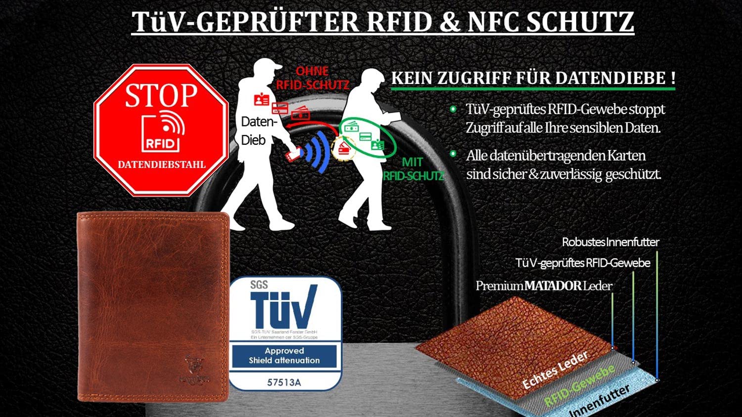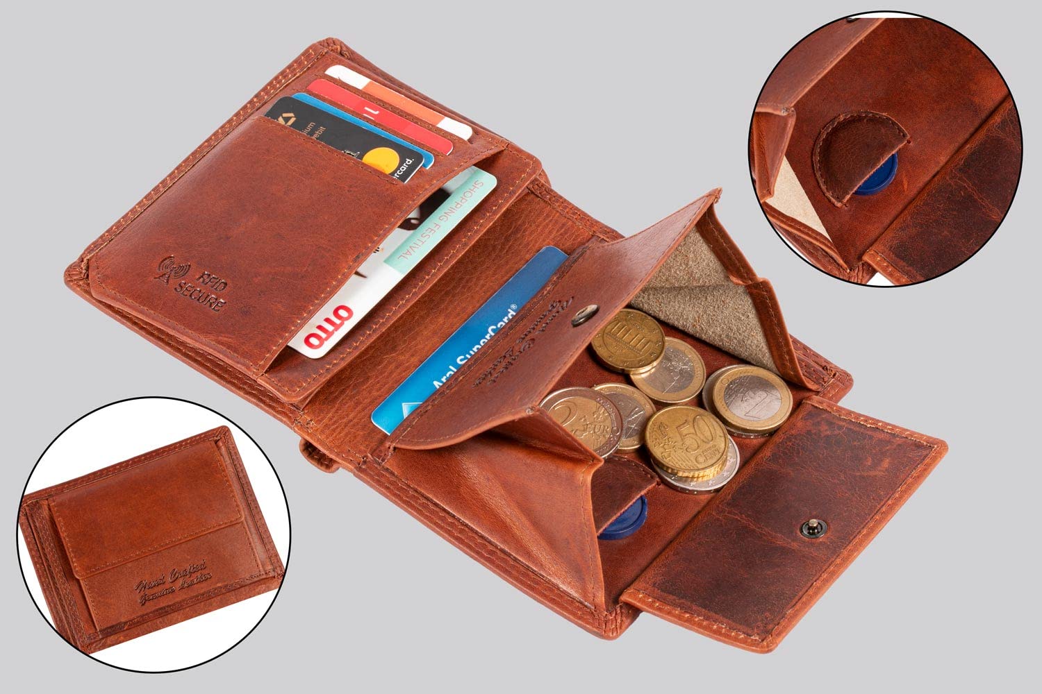 Portfel z certyfikatem: Portfel z certyfikatem TÜV RFID: Nasze portfele są zaprojektowane tak, aby były bezpieczne i niezawodnie chronione przed kradzieżą danych za pomocą naszego zintegrowanego i sprawdzonego blokera RFID. Nie daj żadnych szans złodziejom danych.