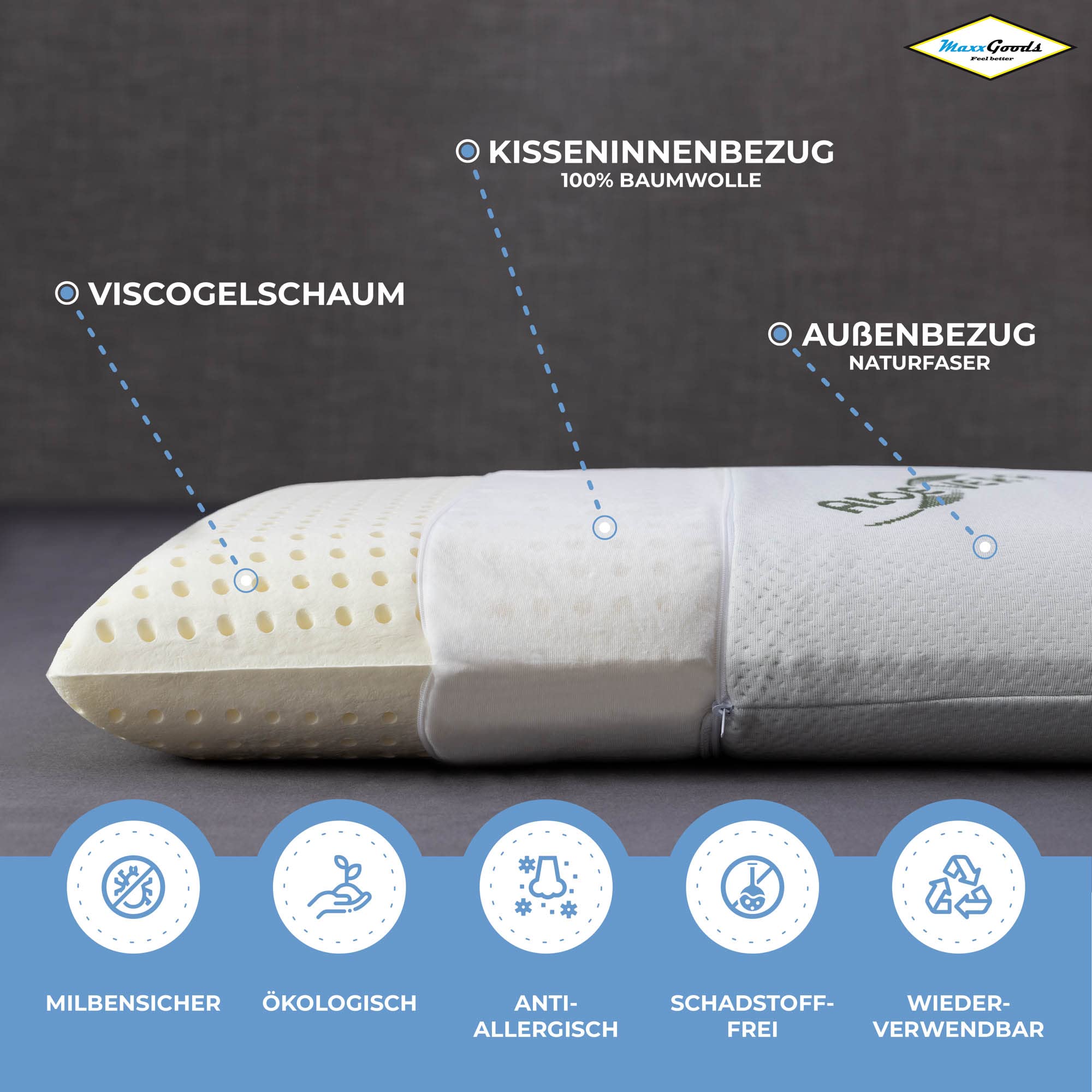 MaxxGoods Feelgood to innowacyjna ortopedyczna poduszka podpierająca kark HWS, która zapewnia niezrównany komfort i wsparcie dla Twojego kręgosłupa. Ten zestaw dwóch poduszek o wysokości 15 cm został stworzony z myślą o osobach, które cierpią na bóle szyi i karku, a także dla tych, którzy pragną poprawić jakość swojego snu.