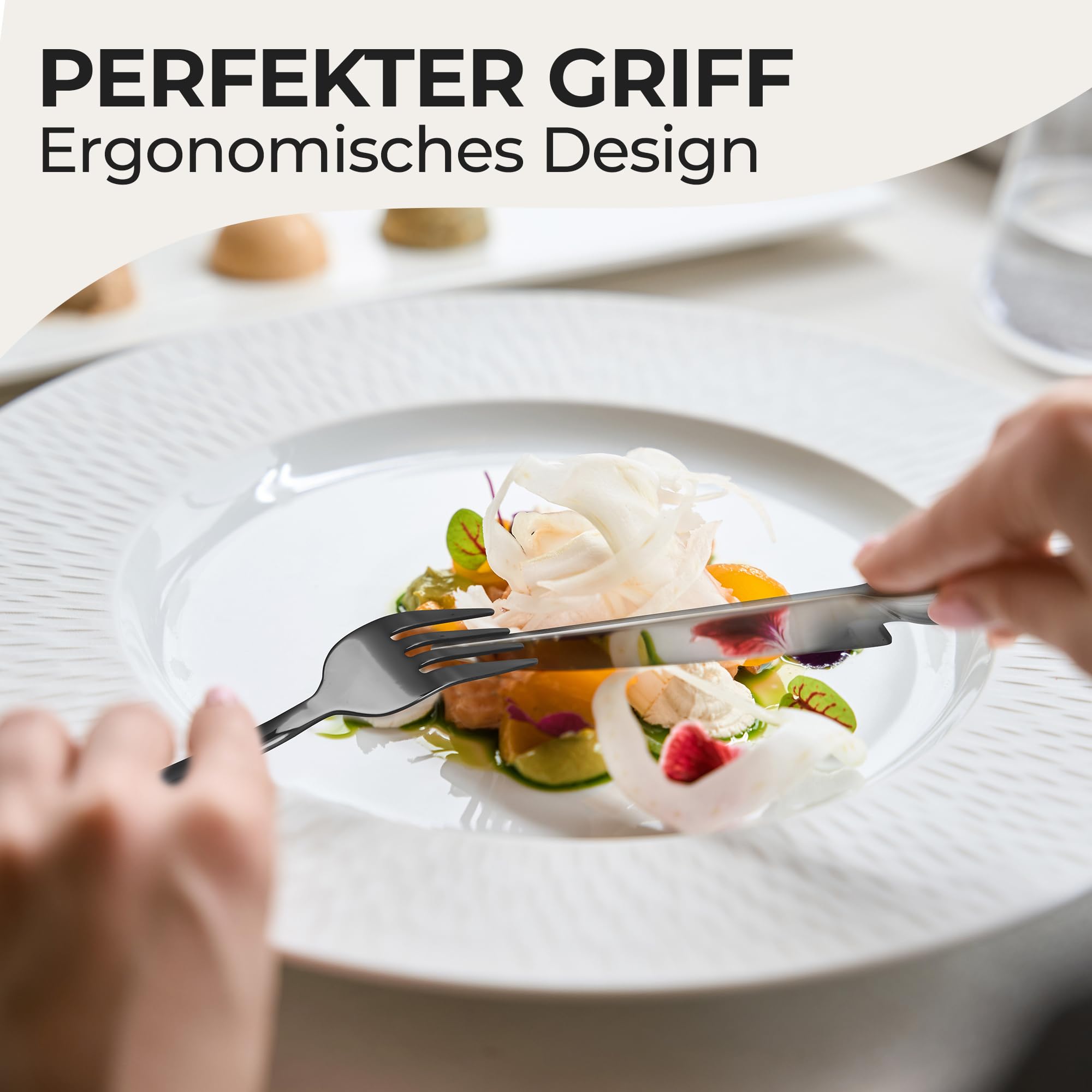 Zestaw MIAMIO wyróżnia się także ergonomicznym kształtem, który zapewnia wygodę podczas użytkowania. Starannie zaprojektowane uchwyty sztućców gwarantują pewny chwyt, co sprawia, że jedzenie staje się przyjemnością.