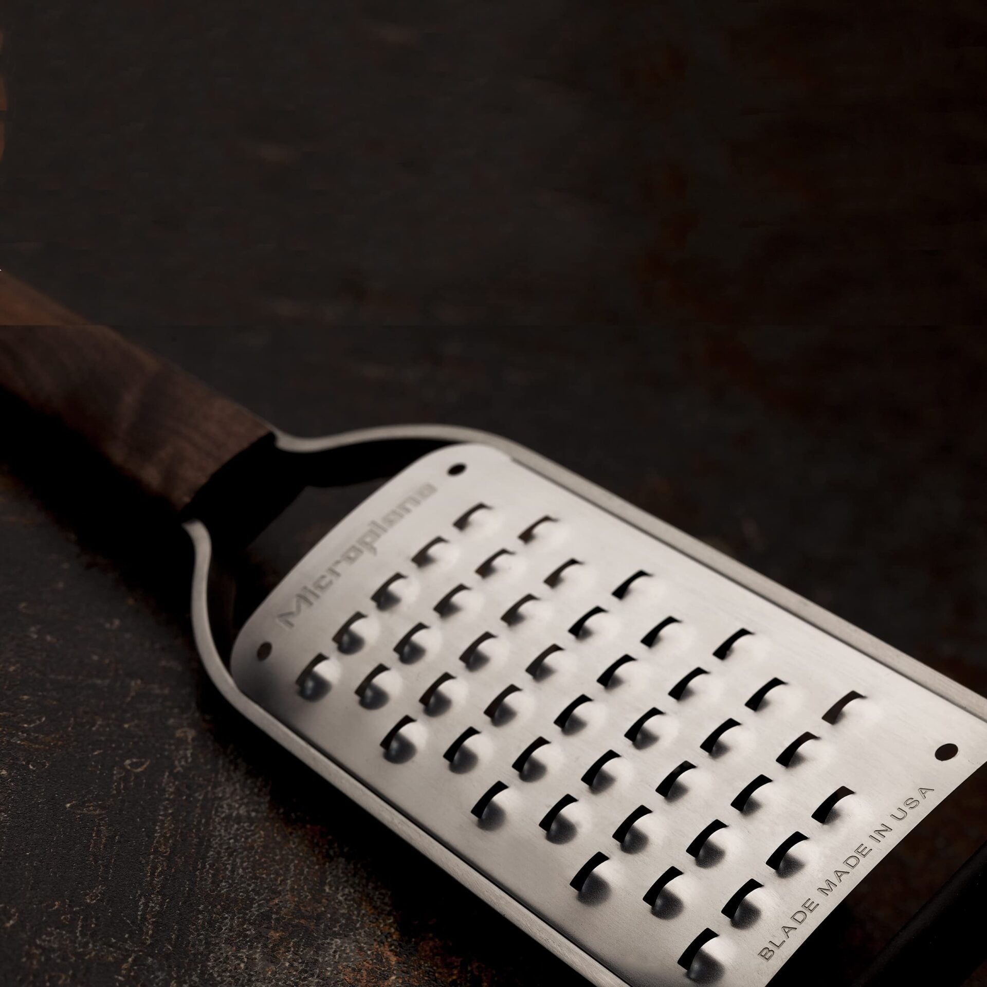 Microplane Tarka kuchenna wykonana o grubych ostrzach do ziemniaków, cukinii, marchwi, jabłek, kapusty i sera z serii Master z drewna orzechowego i stali nierdzewnej