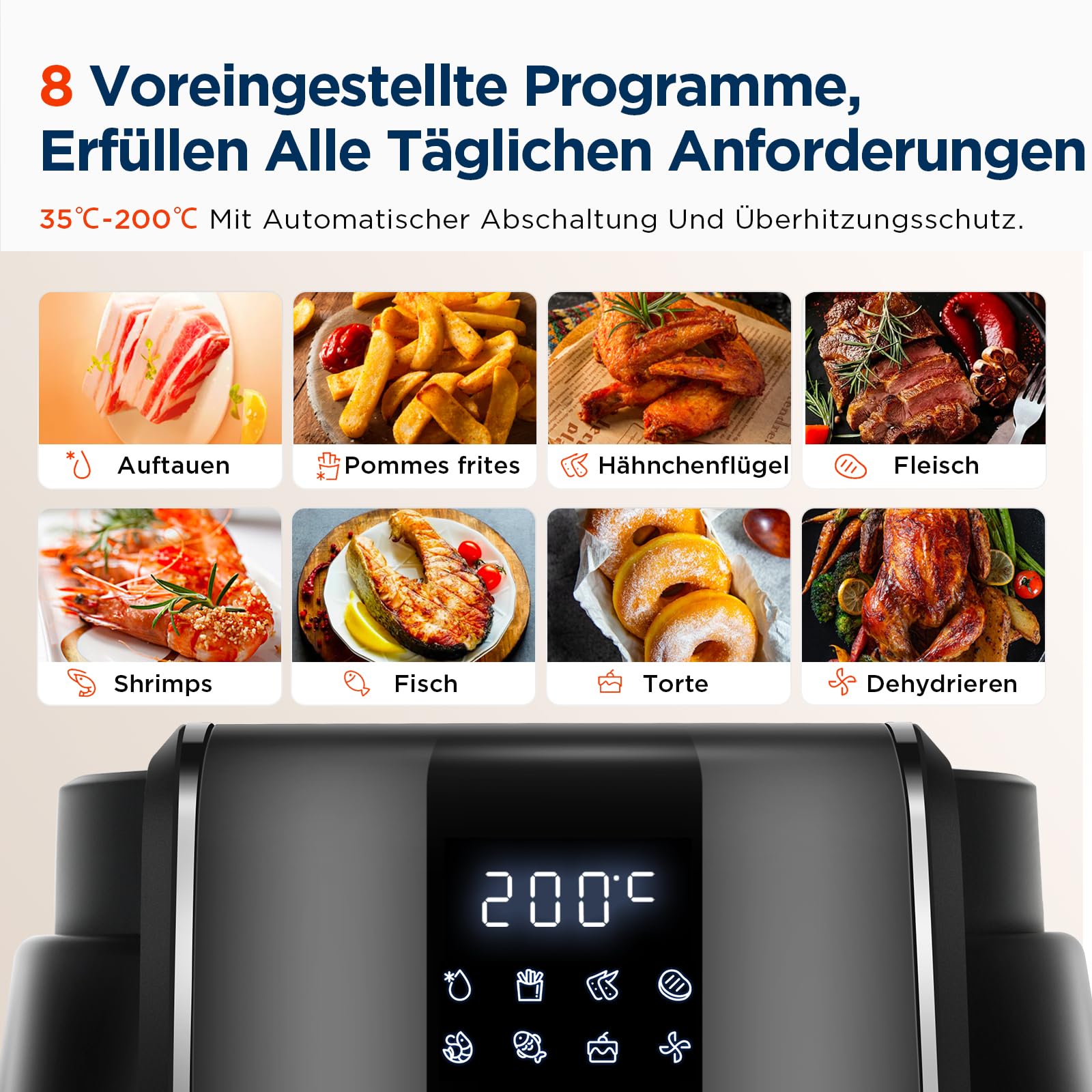 ✅ 【8 wstępnie zaprogramowanych: 【8 wstępnie zaprogramowanych trybów gotowania】Wyświetlacz LED z 8 wbudowanymi programami (smażenie na gorącym powietrzu, opiekanie, pieczenie, suszenie, podgrzewanie i przygotowywanie mrożonych produktów). Precyzyjny czas (60 min.) oraz kontrola temperatury (35-200°C) z automatycznym wyłączaniem i z