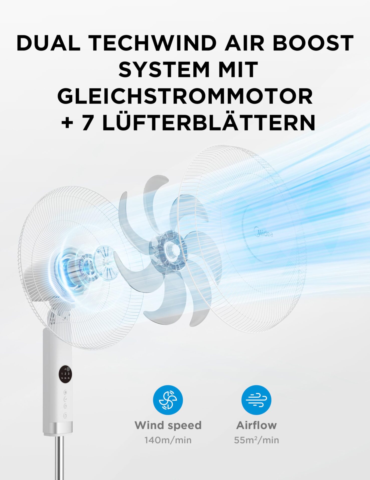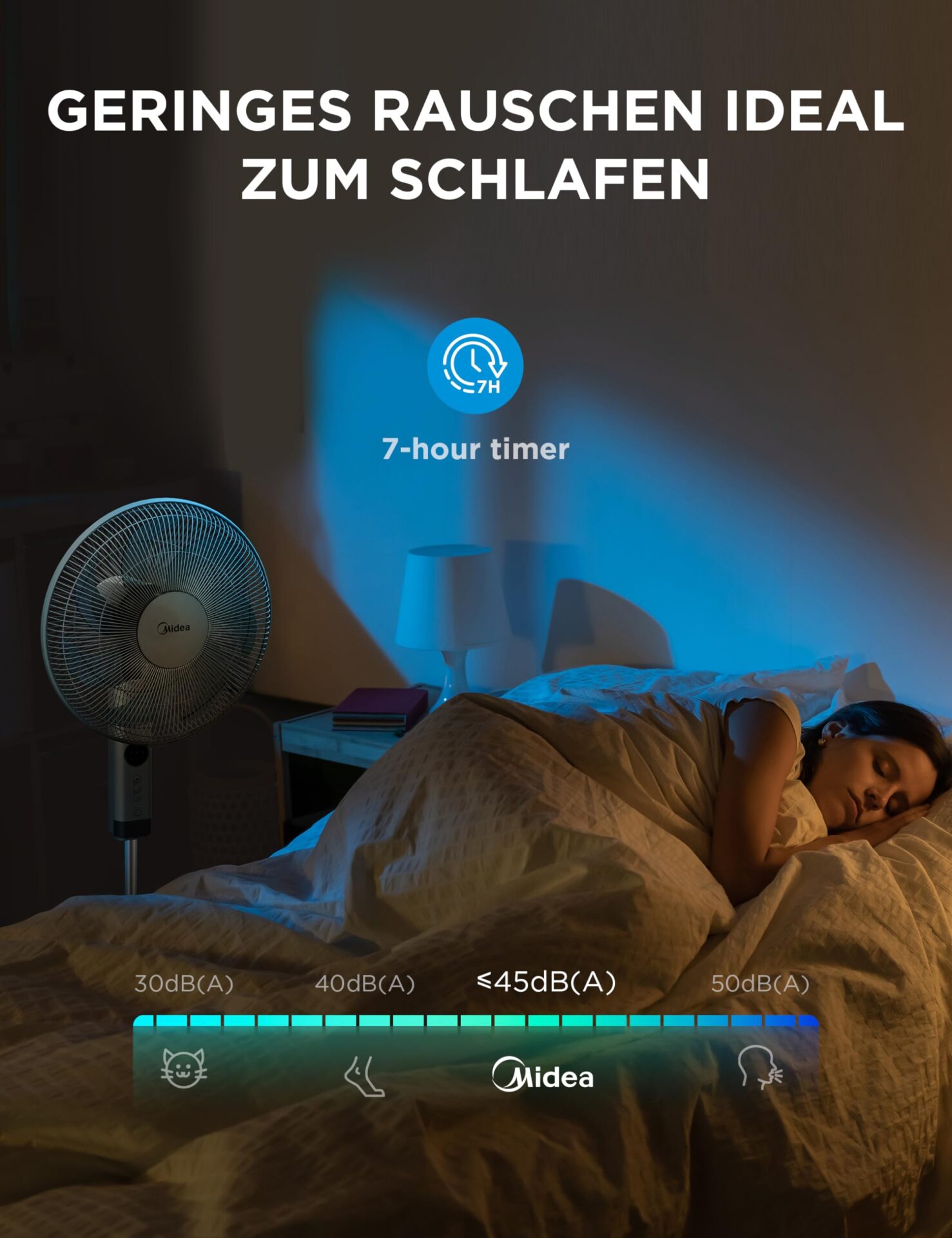 Jednym z kluczowych atutów Midea MFS400R0APW jest cicha praca, dzięki zastosowaniu technologii DC, co sprawia, że wentylator działa niemal bezszelestnie. To idealne rozwiązanie do sypialni, biura czy innych przestrzeni, gdzie komfort akustyczny jest priorytetem. Dodatkowo, wentylator wyposażony jest w 7 łopatek, co zapewnia dużą objętość wiatru i skuteczne rozprzestrzenianie chłodnego powietrza w pomieszczeniu.