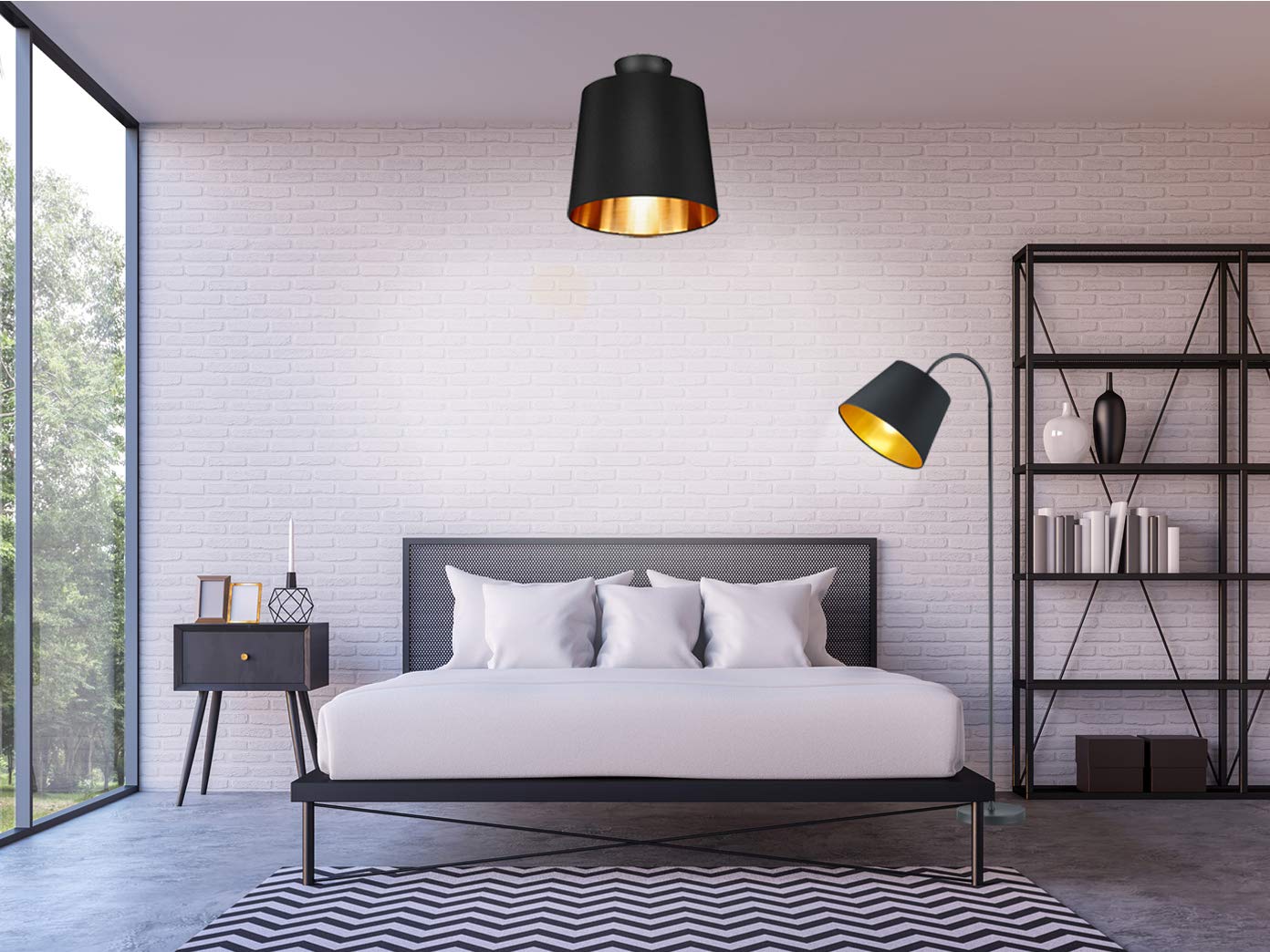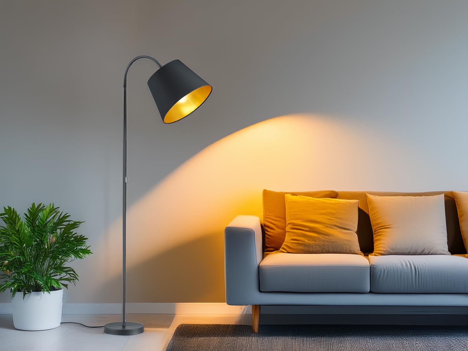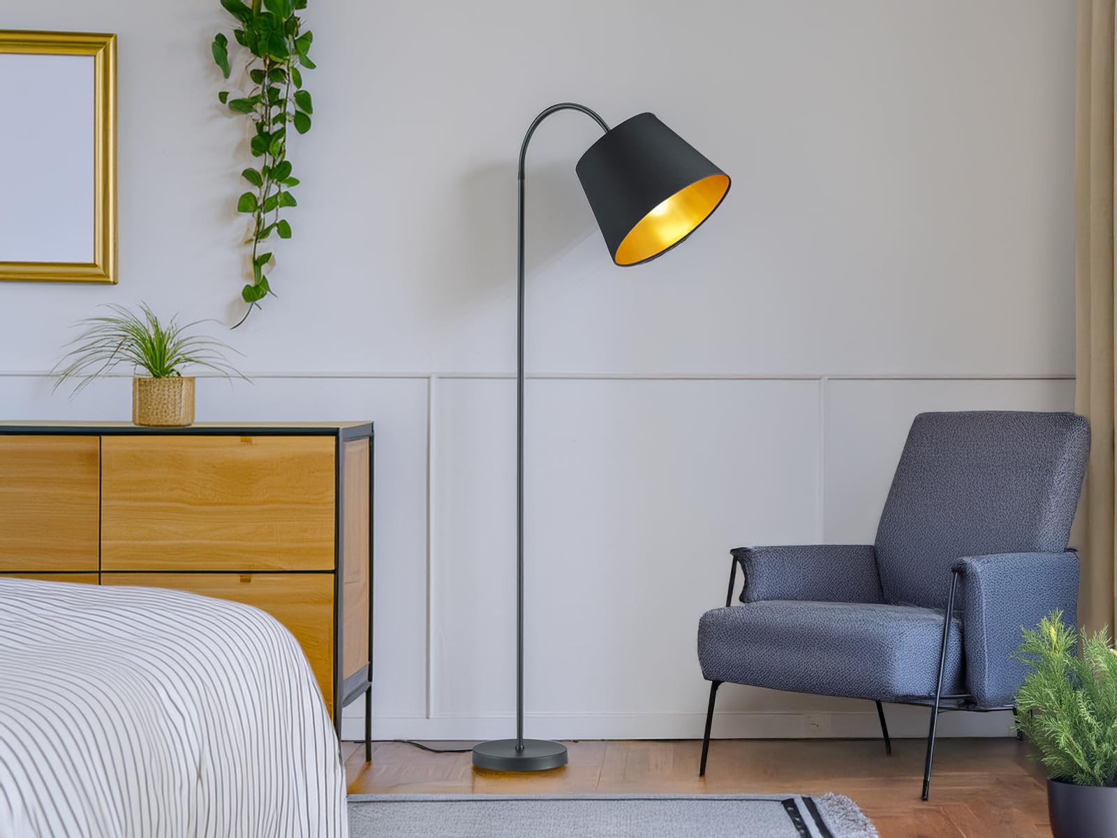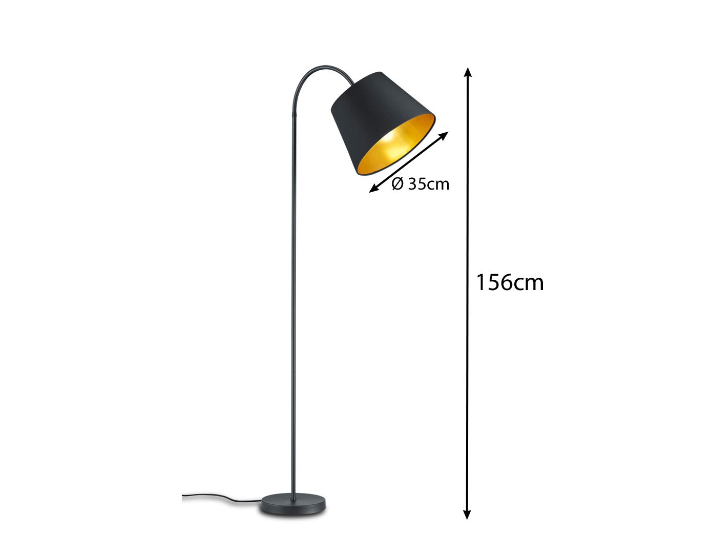 Lampa o wysokości 156 cm z szerokim abażurem o średnicy 35 cm przyciąga wzrok dzięki swoim eleganckim detalom. Jej konstrukcja z matowego czarnego metalu sprawia, że wpisuje się w wiele stylów aranżacyjnych – od nowoczesnego po klasyczny. Złoty kolor wewnętrznej strony abażura wprowadza ciepło i przytulność, co czyni tę lampę idealnym wyborem do każdego pomieszczenia.