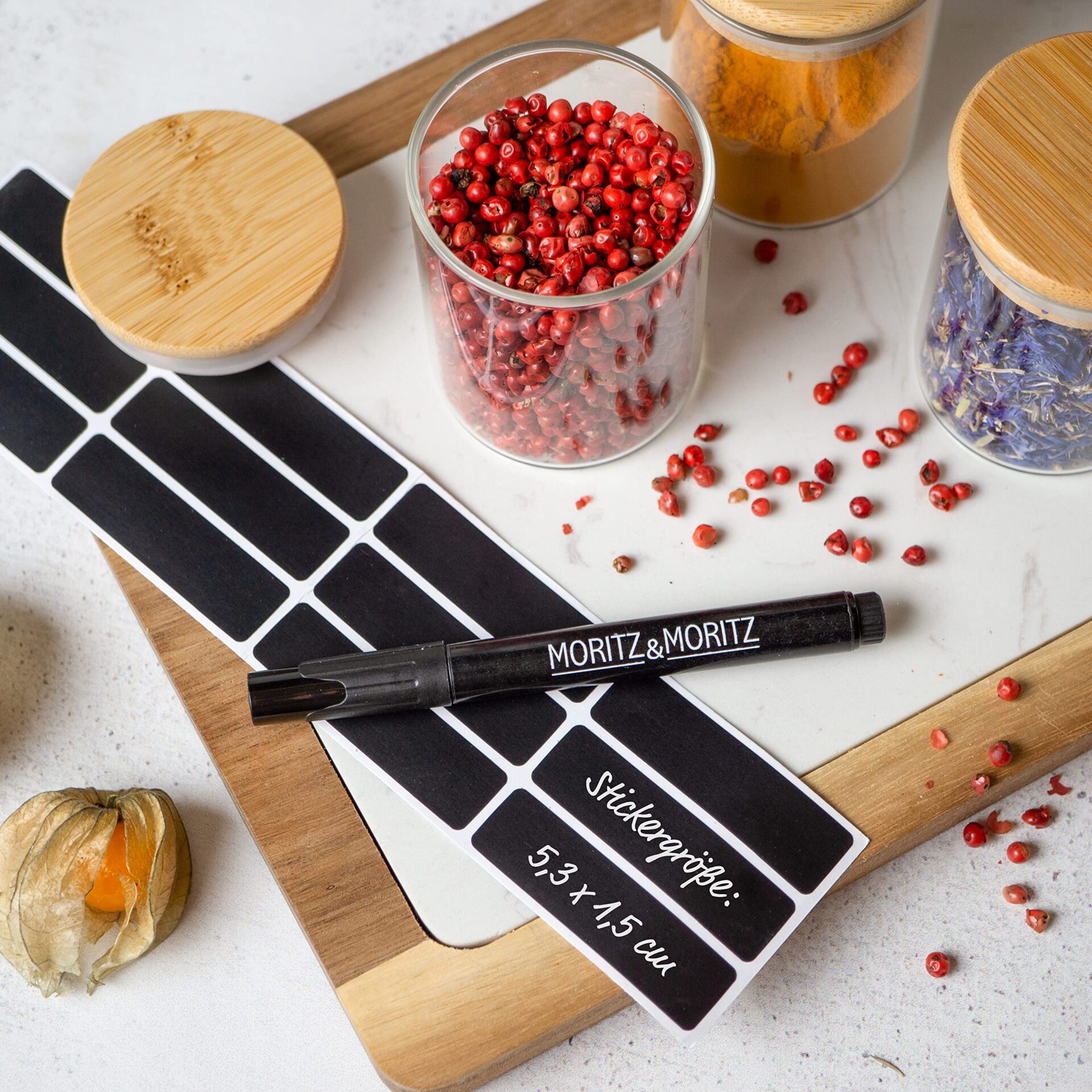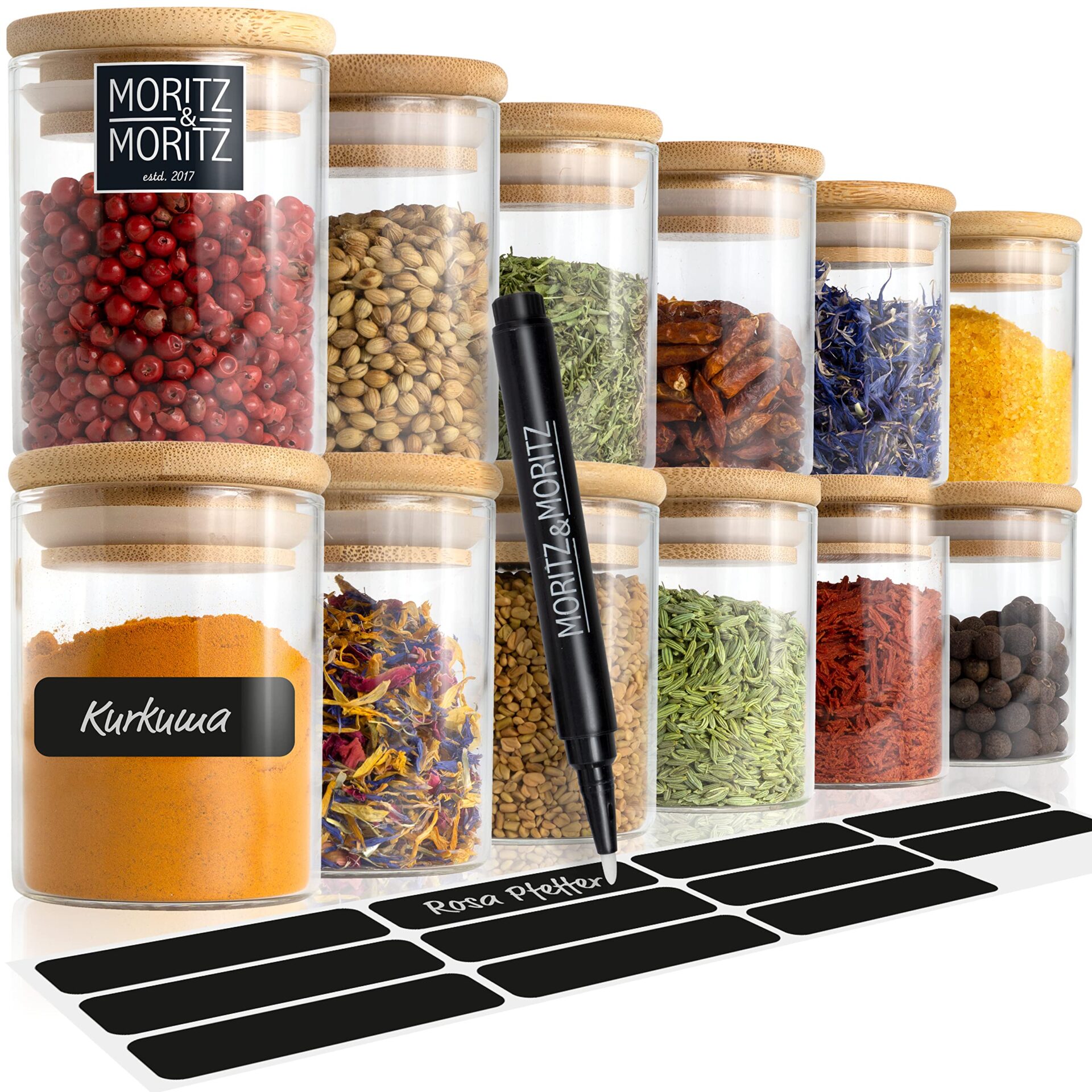 ✅ Zestaw puszek na: Zestaw puszek na przyprawy – Moritz & Moritz 12 okrągłych słoików na przyprawy, każdy po 125 ml (5,5 cm Ø x 8 cm wysokości), z 12 naklejkami i 1 pisakiem kredowym do organizera przypraw. Odkryj minimalistyczne słoiki na przyprawy z hermetyczną pokrywką dla Twoich małych ukochanych przypraw.