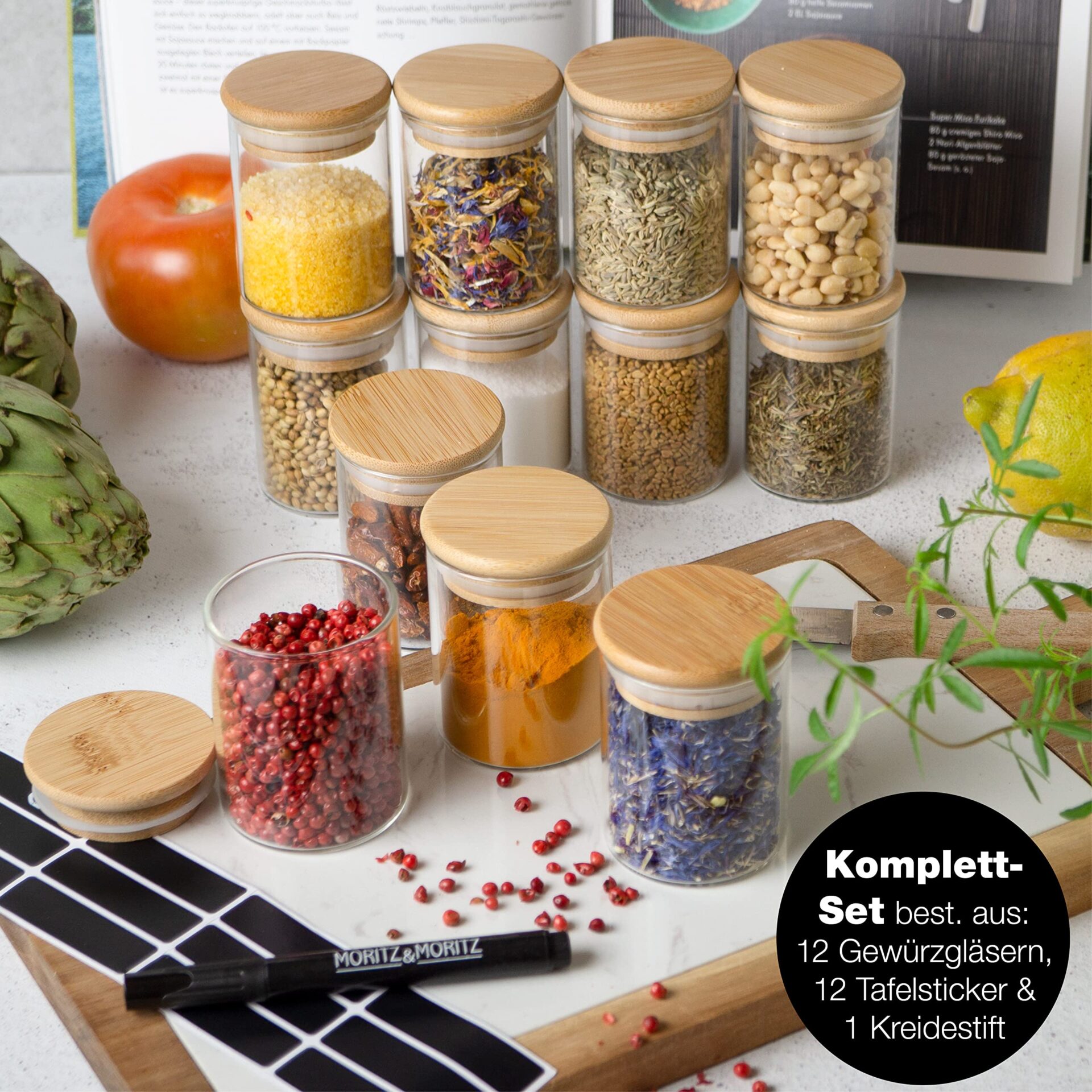 Moritz & Moritz Słoiki na przyprawy – 12 szklanych pojemników na przyprawy o pojemności 125 ml każda. 24 naklejek na tablicę i 1 kredę – okrągłe hermetyczne słoiki na przyprawy, zioła i herbatę