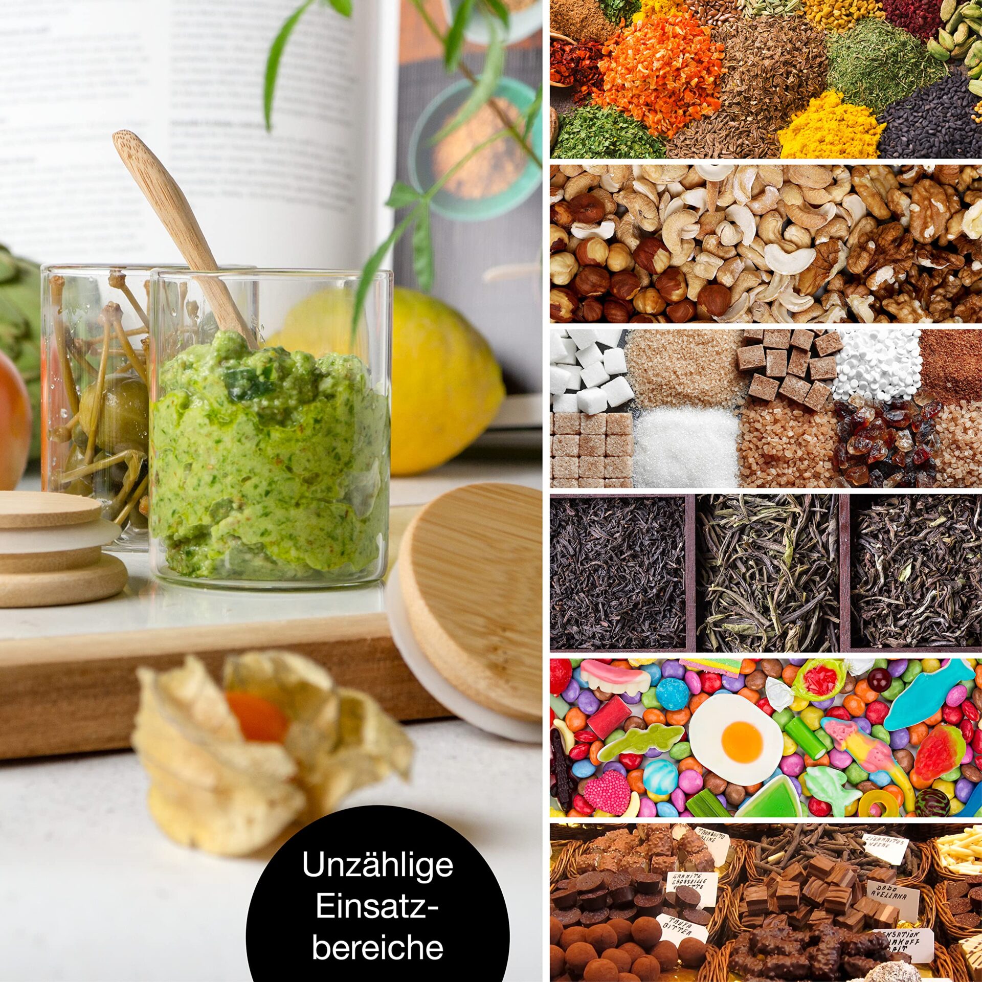 ✅ Szczelna i trwała: Szczelna i trwała – każda puszka na przyprawy ma wysokiej jakości bambusową pokrywkę. Zintegrowana uszczelka silikonowa bez BPA zapewnia szczelne zamknięcie pojemnika.