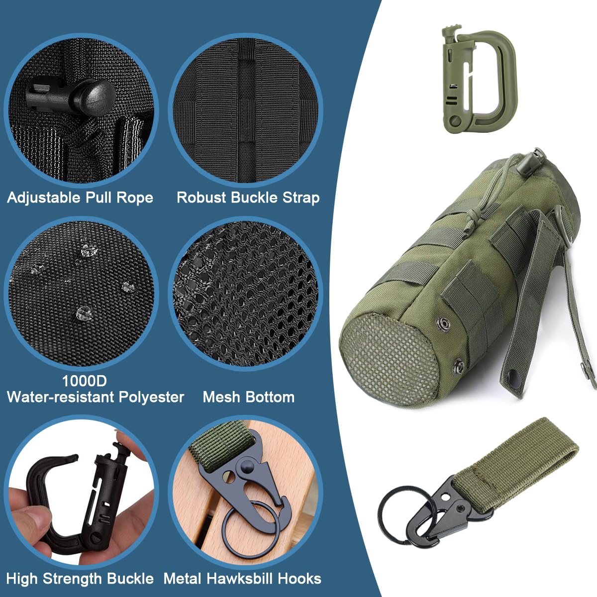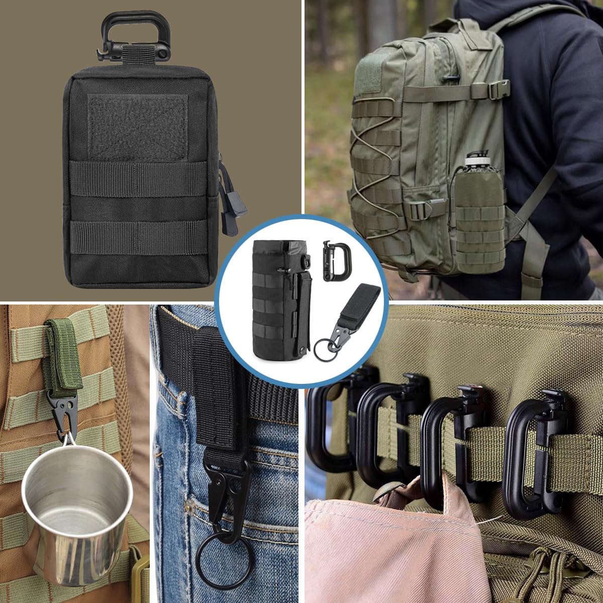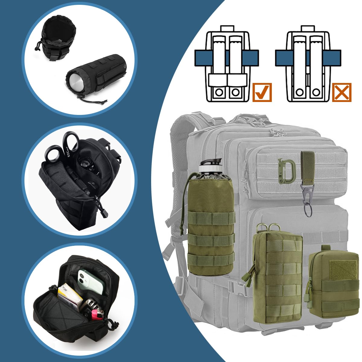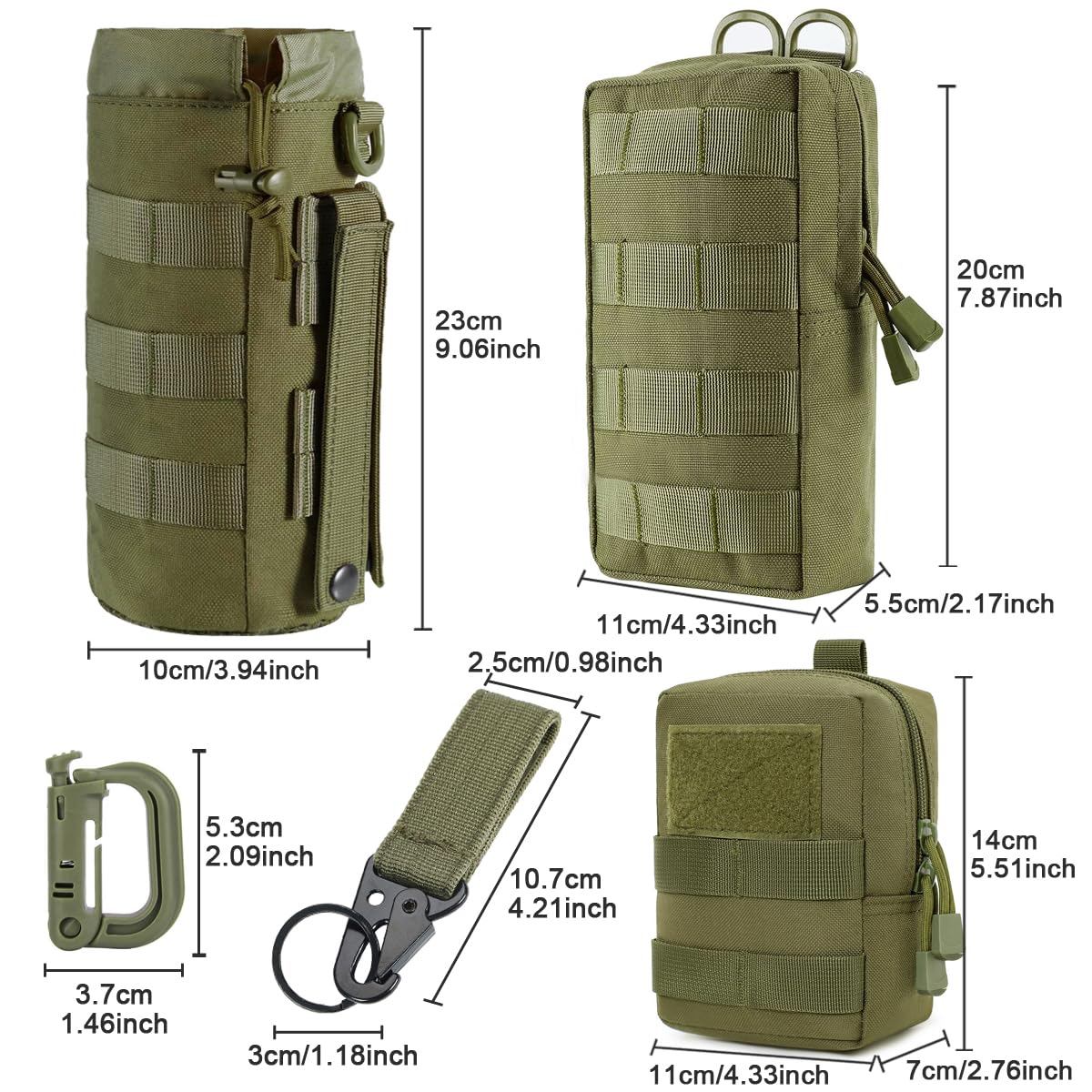 Co otrzymasz: Opakowanie: Co otrzymasz: Opakowanie zawiera 2 woreczki Molle, 1 woreczek na butelkę z wodą, 3 karabińczyki do szybkiego zwalniania i 3 breloczki. Te torby taktyczne są oferowane w 2 różnych rozmiarach i są w pełni funkcjonalne. Wojskowy woreczek na butelki podłączony do systemu Molle może być używany w połącze