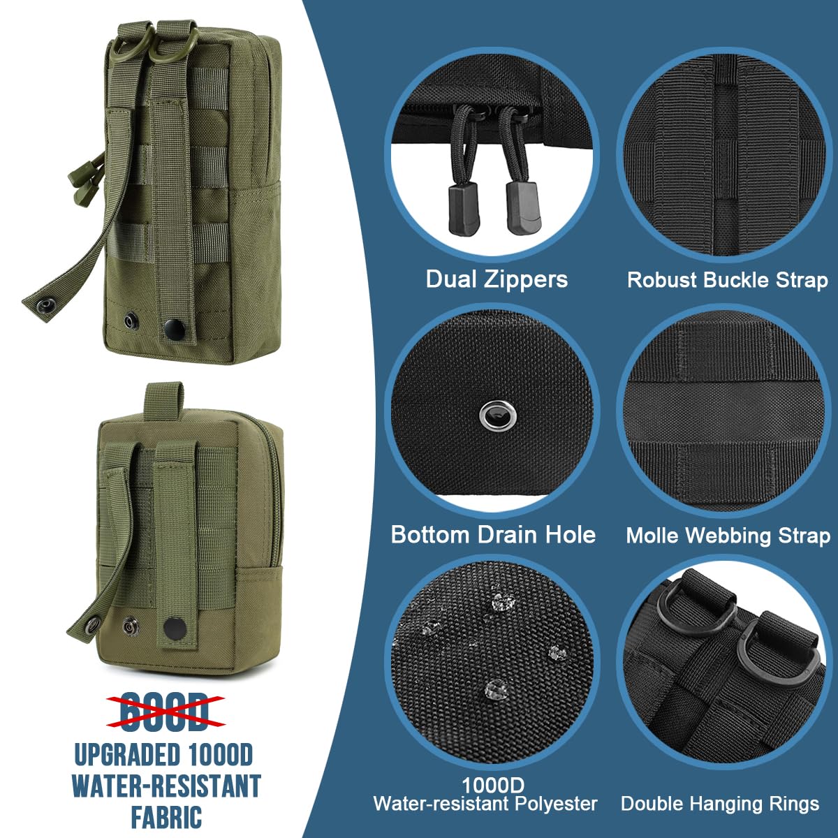 Wytrzymała i wytrzymała:: Wytrzymała i wytrzymała: Ta wielofunkcyjna torba EDC wykonana z ulepszonej wodoodpornej tkaniny poliestrowej 1000D z wytrzymałymi podwójnymi szwami może wytrzymać najtrudniejsze warunki. Etui MUCHER Molle Admin z 2 paskami z klamrą z tyłu można przymocować do plecaków taktycznych, kamizelek bojowych