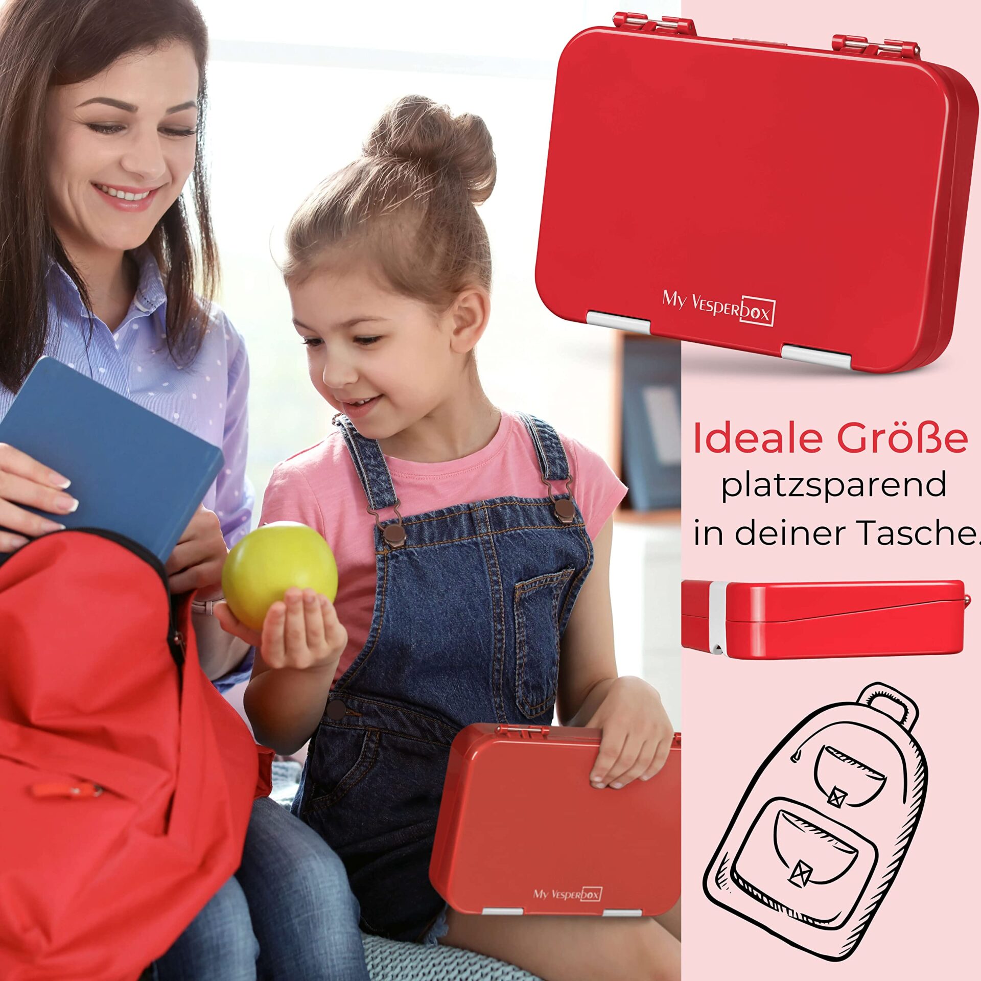 My Vesperbox Len Bento Box pudełko na lunch dla dzieci, 4 + 2 przegródki, bardzo wytrzymałe pudełko na kanapki, idealne do przedszkola i szkoły (czerw