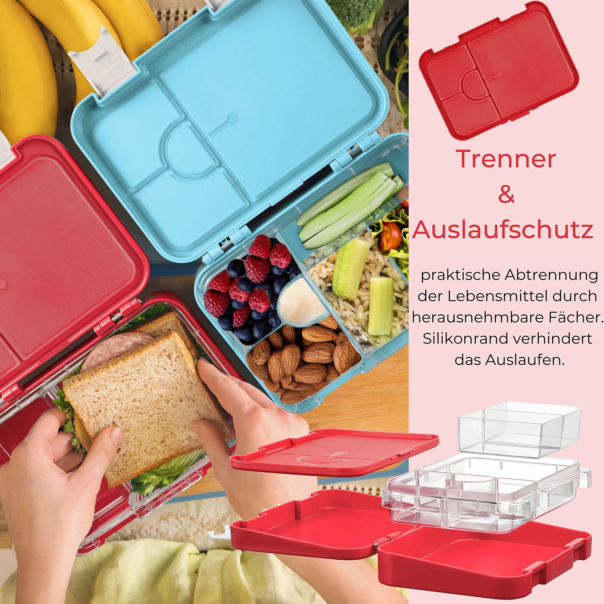Czyste oddzielanie –: Czyste oddzielanie – w pokrywie pudełka Bento znajdują się uszczelki, które zapobiegają mieszaniu się żywności. Uwaga: nie należy wykorzystywać do przechowywania płynnych produktów.