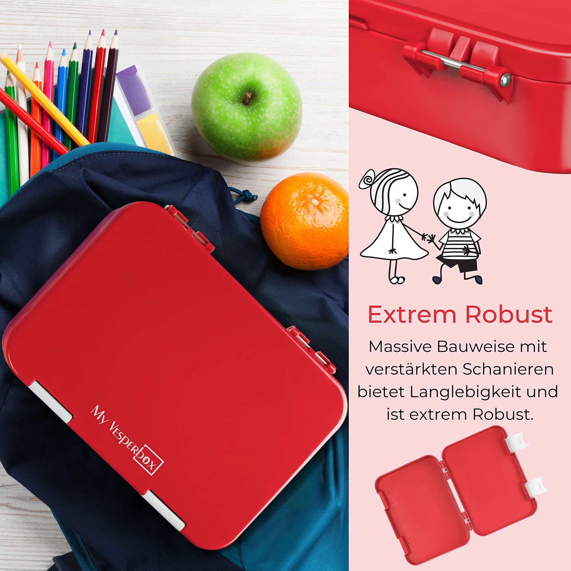Blokady przyjazne dla: Blokady przyjazne dla dzieci – ukośne krawędzie zamykające gwarantują dziecinnie proste otwieranie i sprawiają, że My Vesperbox jest idealnym towarzyszem dla Twoich dzieci.