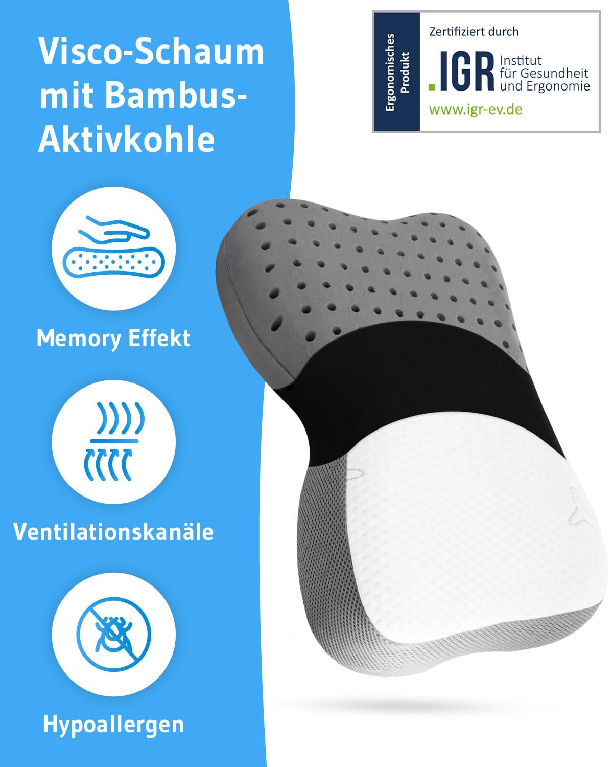 Poduszka pod kark Re-Charge Intense, ergonomiczna poduszka do spania na boku, wysokiej jakości pianka memory z bambusowym węglem aktywnym, innowacyjna technologia dla głębszego snu, poduszka do