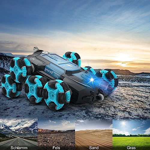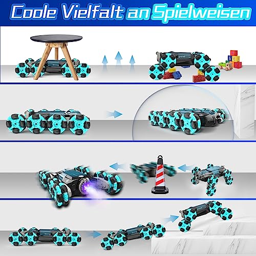 – 360° drehender ferngesteuerter Stunt Auto: Ten cool 8WD samochód zdalnie sterowany ma automatyczny ramie obrotowe, które może obracać się pod różnymi kątami, aby unikać przeszkód. Może poruszać się do przodu, do tyłu, w lewo, w prawo i driftować o 360°. Można go nawet machać do przodu lub do tyłu. Różnorodne funkcje ramienia obrotowego oferują nieskończone możliwości do wykonywania cool akrobacji, pokonywania przeszkód i imponujących trików.