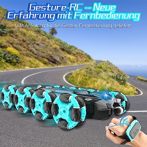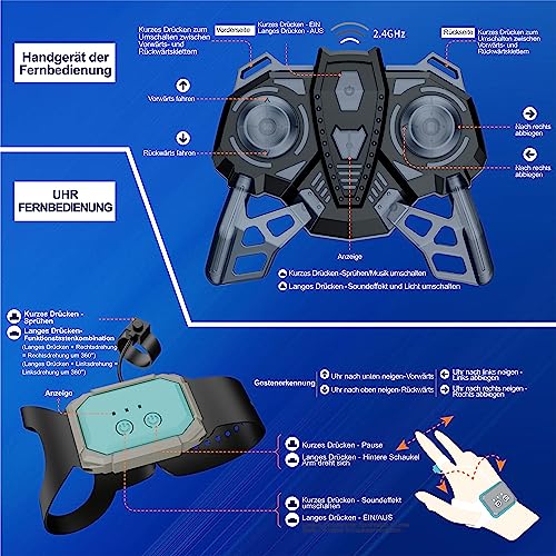 – Handgesteuerter und Ferngesteuerter Modus: Ten samochód zdalnie sterowany obsługiwany jest za pomocą pilota o zakresie 2,4 GHz, który działa na odległość do 30 m. Może być sterowany zarówno za pomocą pilota, jak i za pomocą gestów ręki. Proste ruchy ręką umożliwiają różne akcje samochodu, co rozwija zdolności motoryczne. (Pilot wymaga 2 baterii AAA, nie są one dołączone).