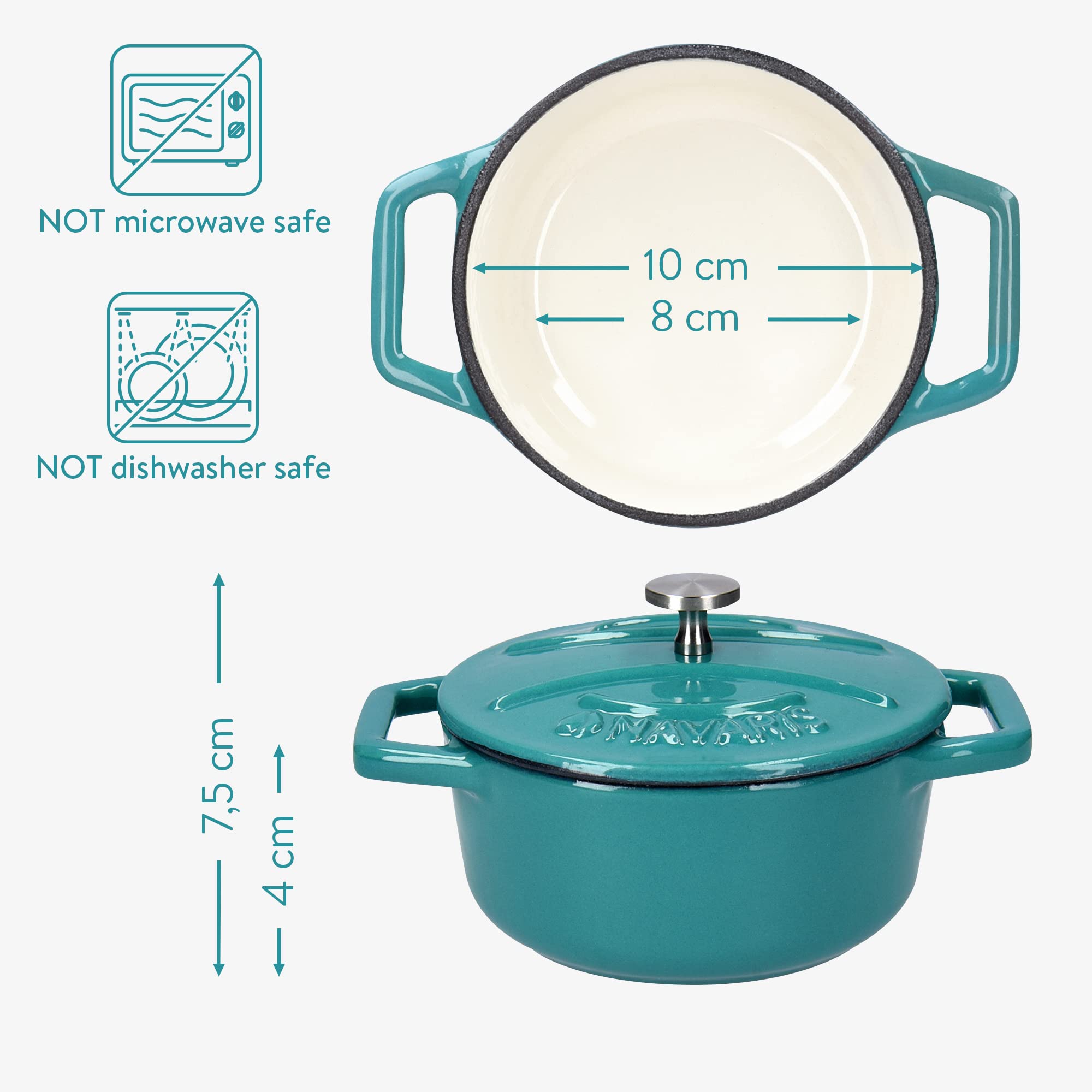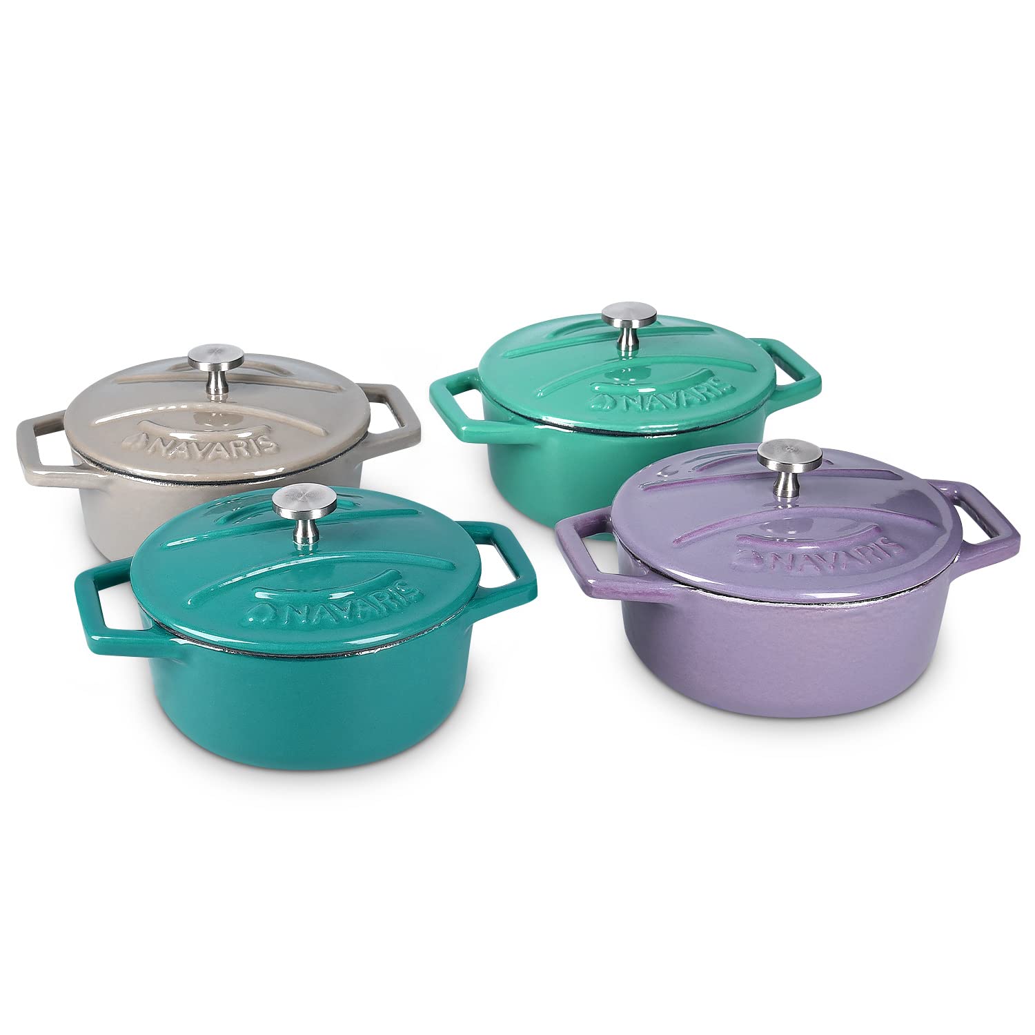 Navaris Mini żeliwny garnek Ø10,5 cm – 4X mały żeliwny garnek 290 ml z pokrywką i powłoką emaliowaną – pojedynczo kuchenka do gotowania gazów indukcyjnych