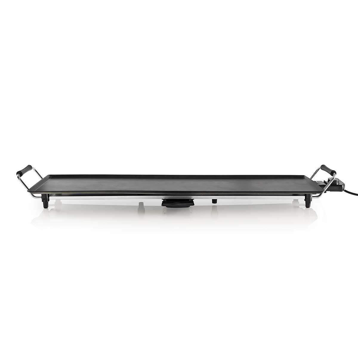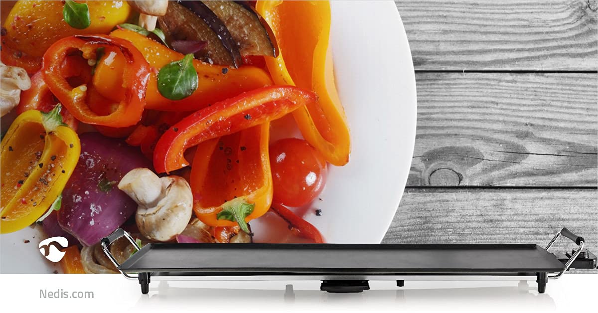 NEDIS Teppanyaki Grill – 50 cm – 1800 W – Control de temperatura ajustable – Revestimiento antiadherente – Piezas extraíbles – Mango Cool Touch – Antideslizante 090 m 1025 mm to elektryczny grill stołowy, który idealnie nadaje się do przygotowywania różnorodnych pysznych potraw na spotkaniach kulinarne z rodziną i przyjaciółmi. Dzięki dużej powierzchni grillowej można jednocześnie przygotować wiele dań, takich jak soczyste mięso, smaczna ryba czy chrupiąca warzywa. Termostat i 5 różnych poziomów temperatury pozwalają idealnie przygotować ulubione potrawy na tym wewnętrznym grillu elektrycznym. Grill stołowy jest szybko nagrzewający się i wyposażony w wysuwany pojemnik na tłuszcz, co umożliwia przygotowanie potraw o niskiej zawartości tłuszczu. Dzięki powłoce nieprzywierającej i odłączalnemu przewodowi zasilającemu grill można łatwo czyścić i szybko przygotować do kolejnego użycia.