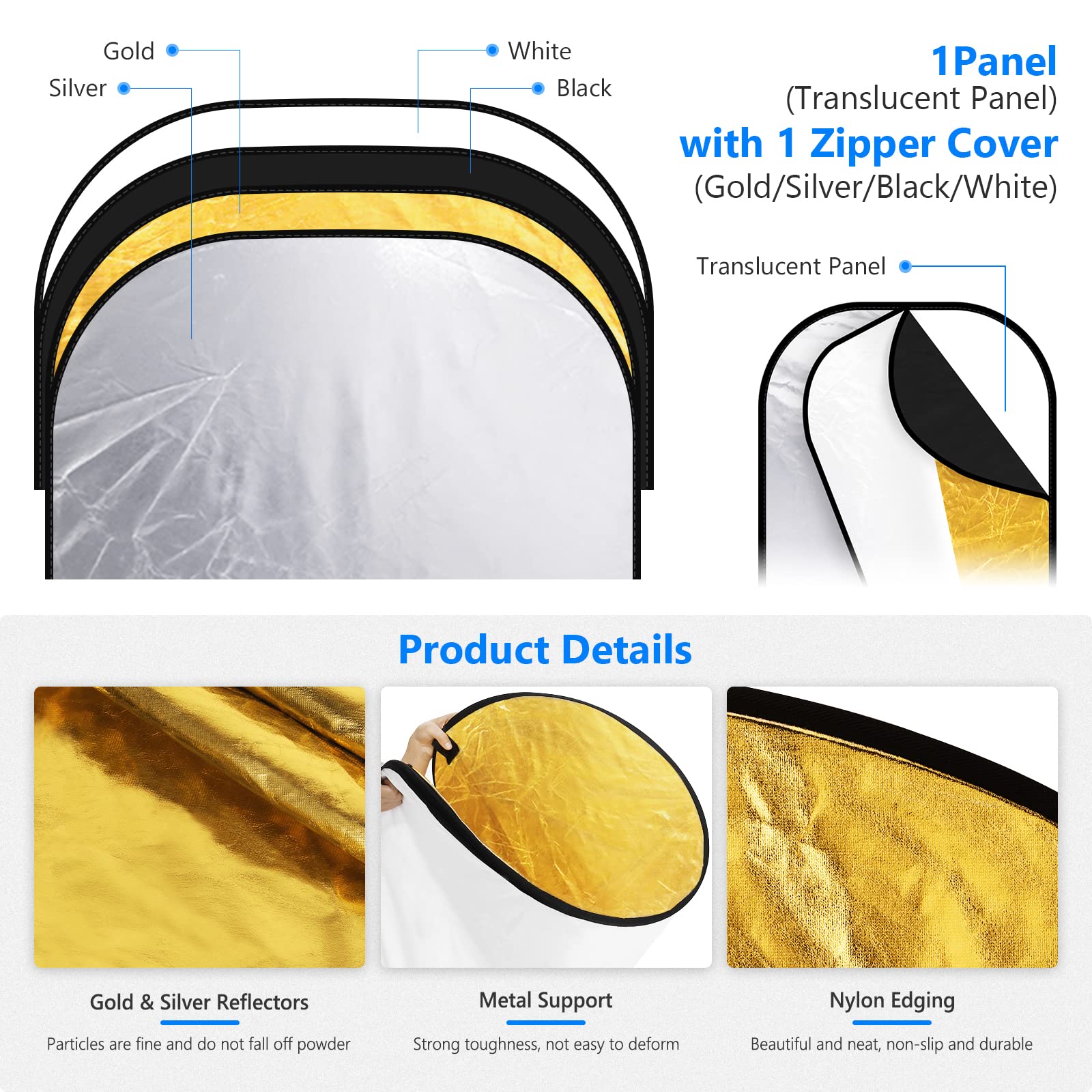 Neewer Przenośny 5 w 1 59″ x 79″/150×200 cm półprzezroczysty srebrny złoty biały i czarny składany okrągły wielopłytowy reflektor świetlny to niezastąpione narzędzie dla każdego fotografa, zarówno profesjonalisty, jak i amatora. Dzięki swoim wielu funkcjom i możliwościom, ten reflektor świetlny sprawdzi się doskonale zarówno w studiu fotograficznym, jak i podczas plenerowych sesji.