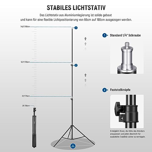 ✅ 【Stabilny stojak świetlny】Stojak: 【Stabilny stojak świetlny】Stojak świetlny ze stopu aluminium jest solidnie zbudowany i można go wydłużyć od 66 do 190 cm, aby zapewnić elastyczne pozycjonowanie światła. Przyciski blokujące umożliwiają regulację wysokości stojaka i mocno zablokować każdą sekcję, aby zapewnić dodatkową stabilność