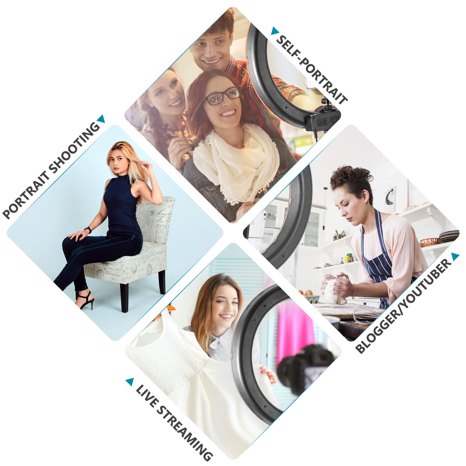 - Dołączone części składowe: 1 x lampa pierścieniowa LED, 1 x statyw do lampy, 1 x podpórka, 1 x uchwyt na telefon komórkowy, 1 x wyzwalacz radiowy, 2 x akumulator litowo-jonowy,