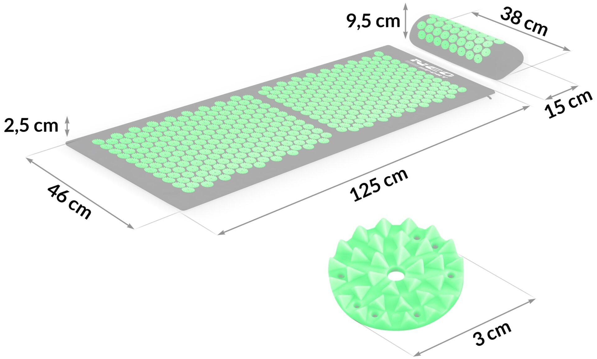Krótki opis: Neo-Sport to kompletny zestaw do akupresury, który zapewnia kompleksową stymulację punktów akupunkturowych na całym ciele. Mata kolczasta o wymiarach 125 x 46 cm posiada zdejmowaną poszewkę z bawełny, co ułatwia utrzymanie jej w czystości. Dodatkowo w zestawie znajduje się poduszka oraz praktyczna torba do przenoszenia, co sprawia, że produkt jest idealny do użytku domowego oraz podczas podróży.