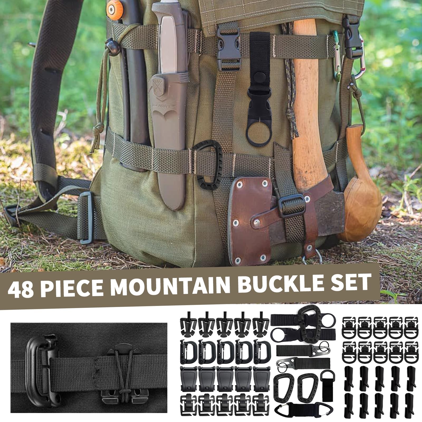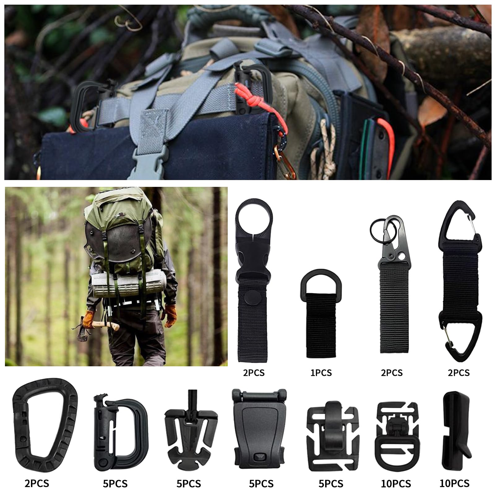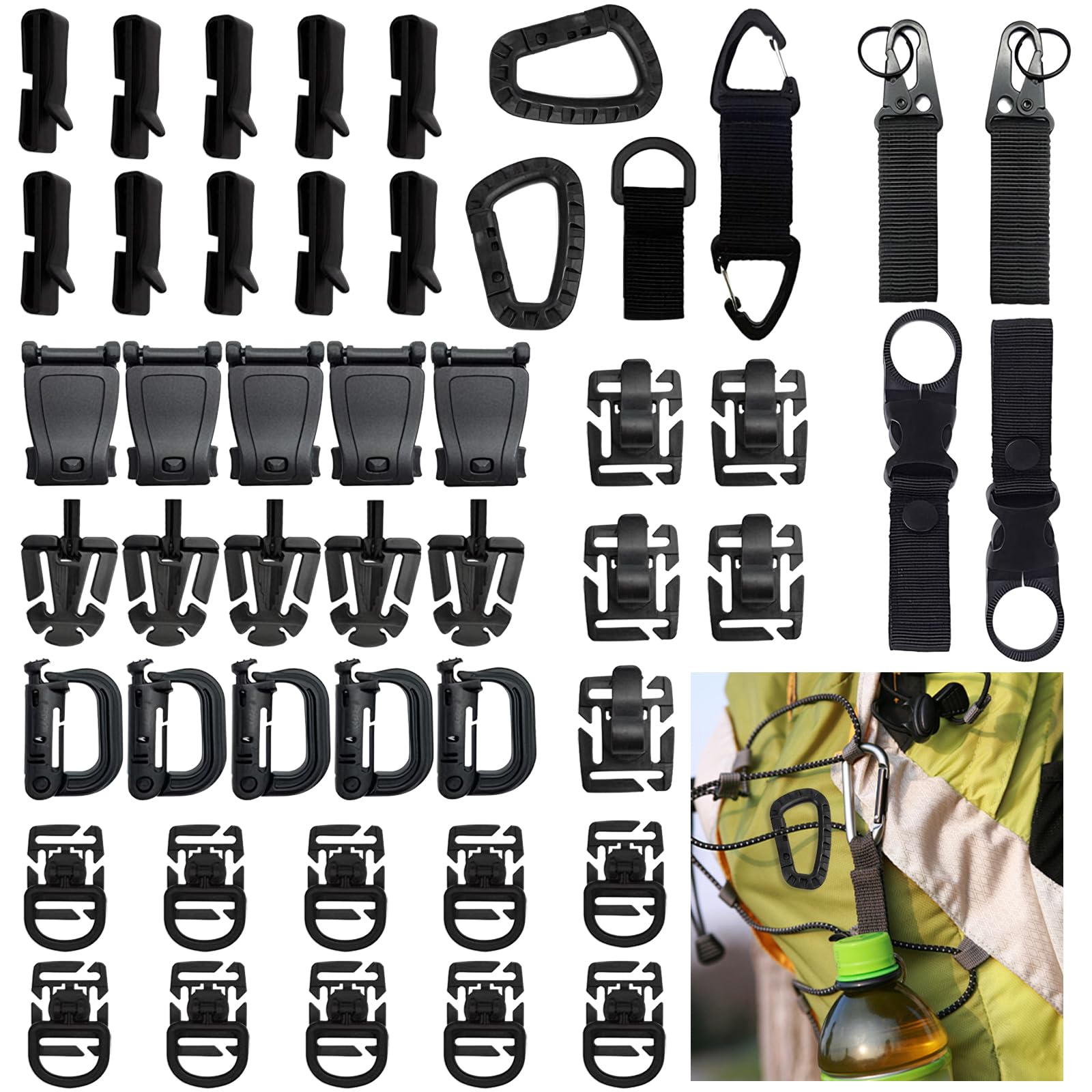 ✅ 【Praktyczne akcesoria do: 【Praktyczne akcesoria do plecaków taktycznych】 Ten zestaw zawiera łącznie 48 sztuk akcesoriów molle, w tym nylonowe akcesoria – haczyk olecranon, wieszak na butelkę z wodą, obrotowy karabińczyk i dużą klamrę D; dominatory siatki, zamknięcie i klamrę D-ring Grimlock, klips do zbierania taśmy, klips m