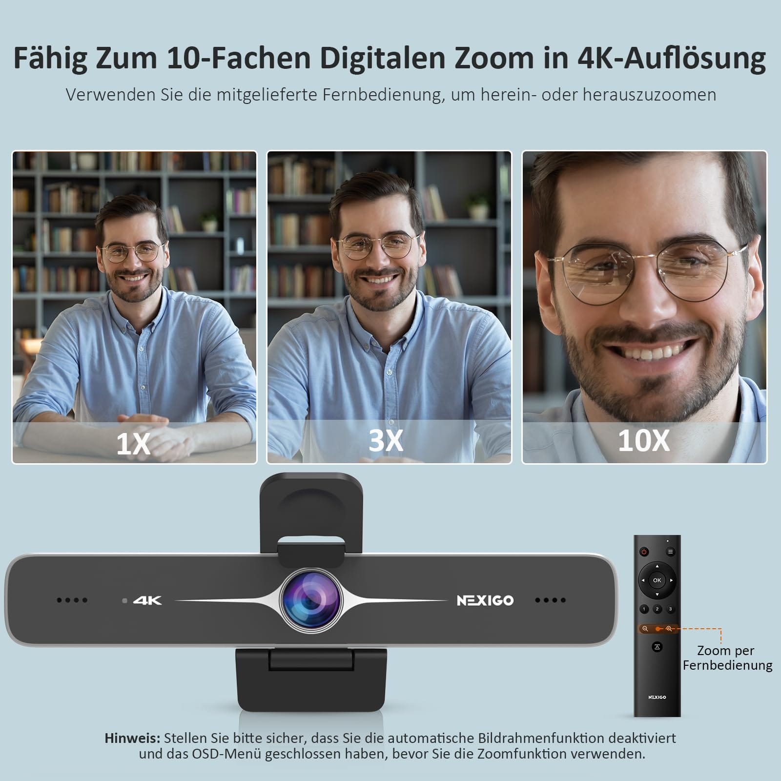 Dodatkowo, kamera jest wyposażona w pilot z 10-krotnym zoomem cyfrowym, który umożliwia łatwe sterowanie rozmowami wideo, nawet z dużej odległości. Za pomocą pilota można wyłączyć kamerę, powiększyć lub pomniejszyć obraz i wiele więcej. Dzięki 10-krotnemu zoomowi cyfrowemu, kamera NexiGo N970P umożliwia stopniowe powiększanie lub pomniejszanie za pomocą jednego naciśnięcia przycisku. Przed użyciem funkcji powiększenia należy jednak wyłączyć funkcję automatycznego kadrowania i zamknąć menu OSD.