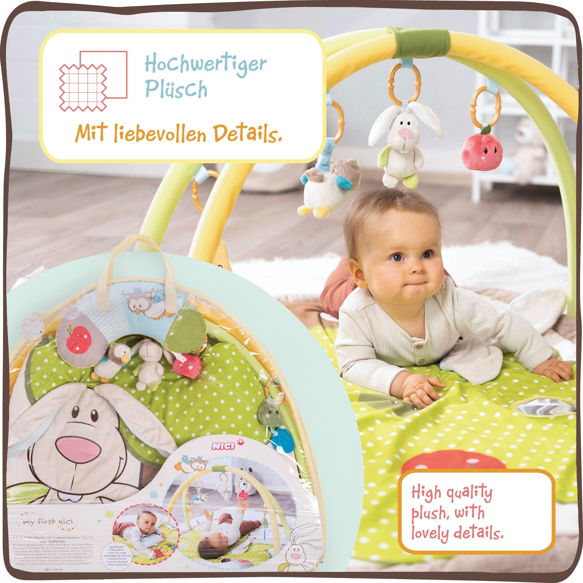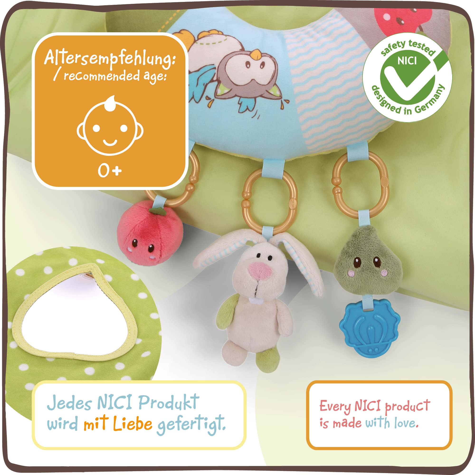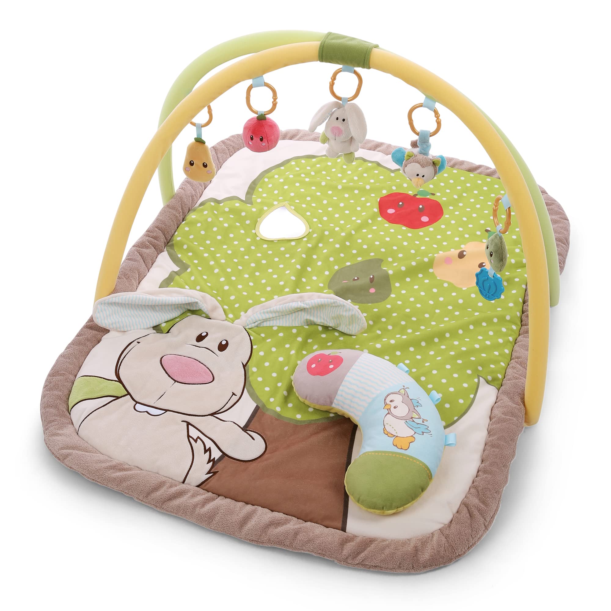 NICI Kocyk Edukacyjny z Poduszką i Króliczkiem, Sówką, 80 x 110 cm | Łuk do Zabawy z 5 Odłączanymi Figurkami w Torbie | Mata dla Niemowlaków – 48510