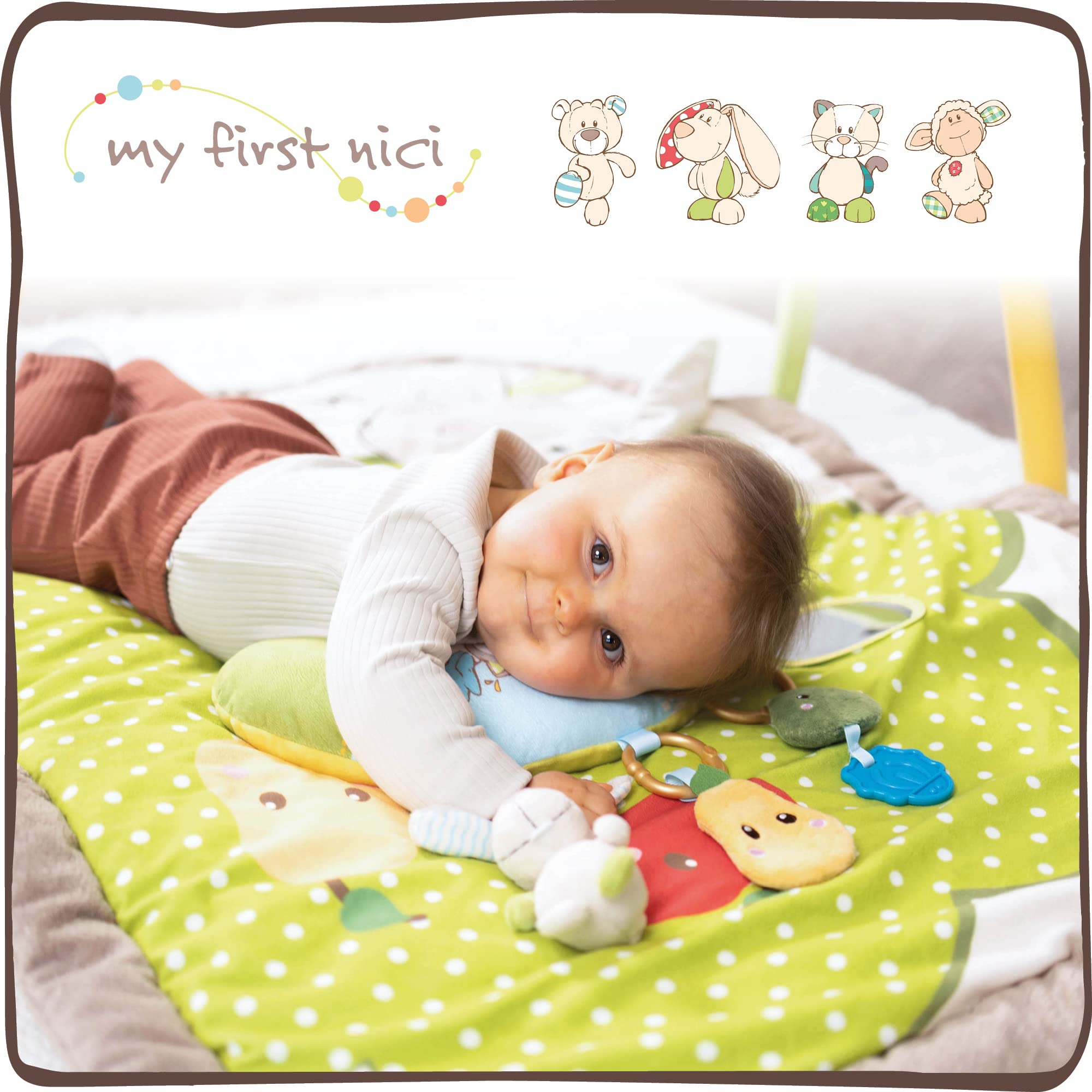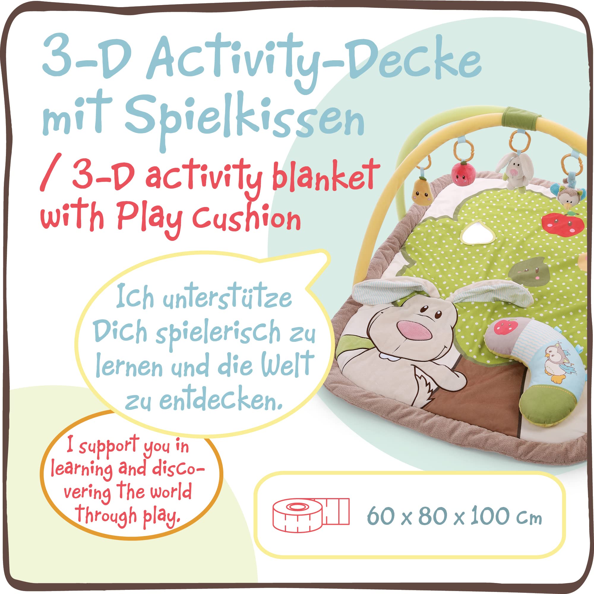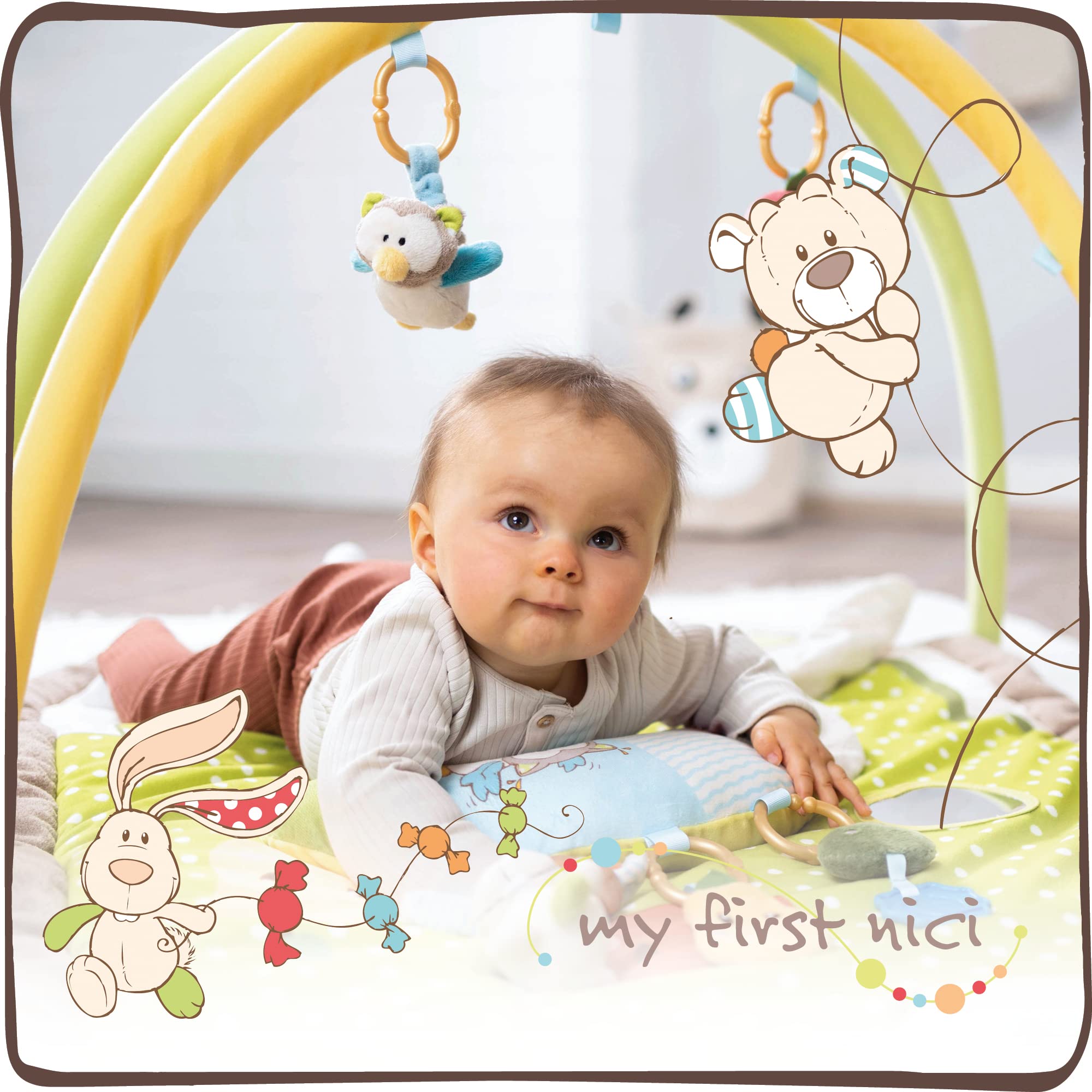 NICI Kocyk Edukacyjny z Poduszką i Króliczkiem, Sówką, 80 x 110 cm | Łuk do Zabawy z 5 Odłączanymi Figurkami w Torbie | Mata dla Niemowlaków – 48510