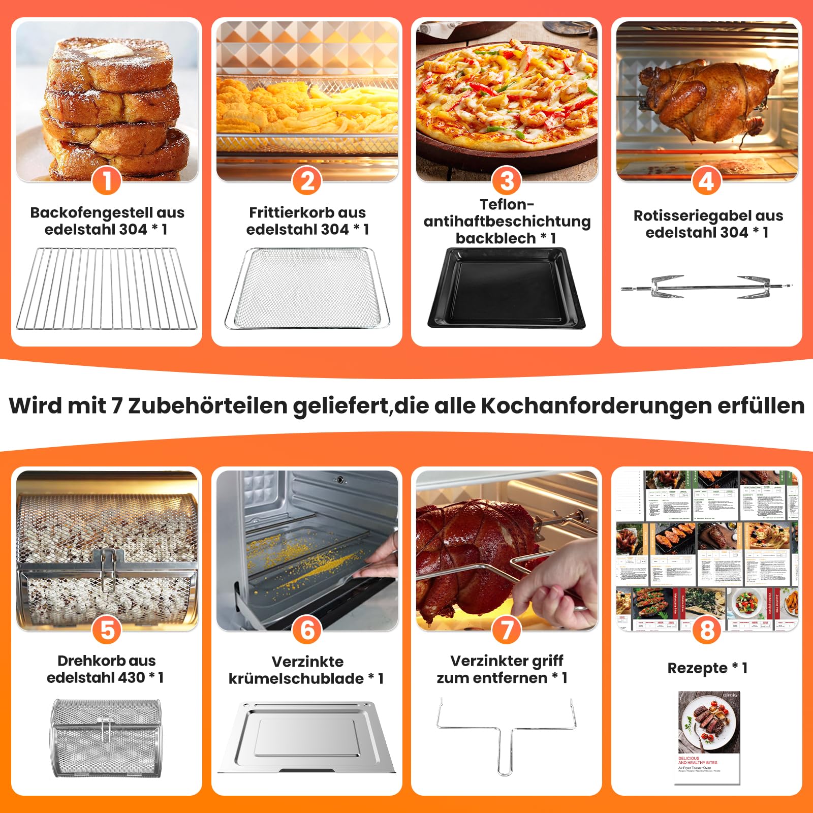 Frytkownica OIMIS jest także dostarczana z zestawem 7 praktycznych akcesoriów: formą do pieczenia, koszem do frytek, rusztem, obrotowym spittem, obrotowym koszem, pomocą do wyjmowania oraz szufladą na okruchy. Każde z tych akcesoriów zostało zaprojektowane, aby maksymalizować funkcjonalność frytkownicy, a także ułatwić przygotowywanie różnych potraw, od frytek po pieczenie chleba.