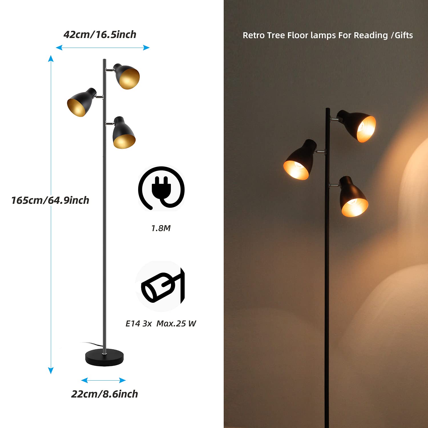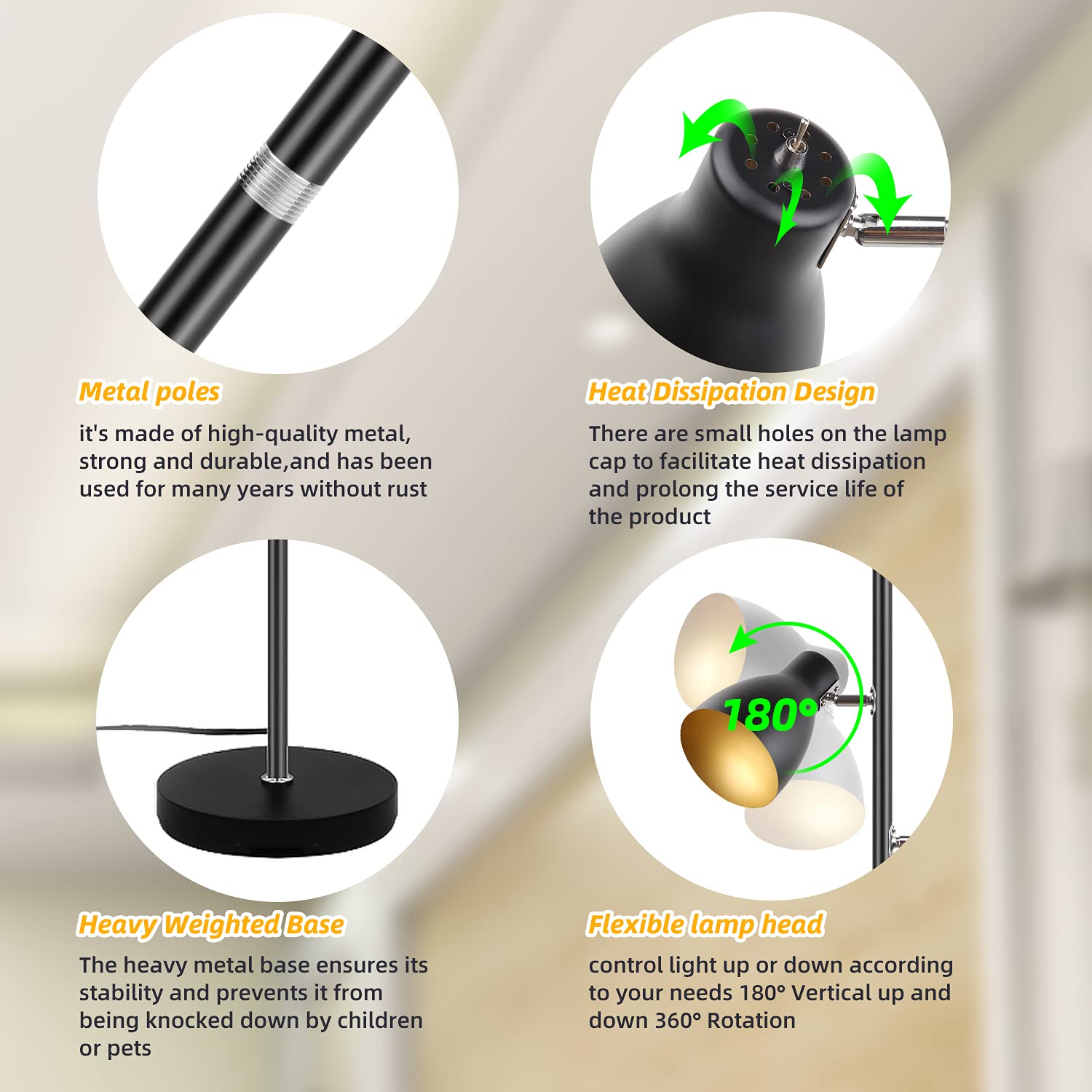 Miękkie światło i: Miękkie światło i odprowadzanie ciepła Trwały materiał: Wysokiej jakości lampa stojąca w stylu vintage, wykonana z metalowej ramy dla wysokiej stabilności i z dużą okrągłą podstawą dla utrzymania równowagi. Każda oprawa lampy jest wyposażona w osiem otworów odprowadzających ciepło, aby skutecznie od