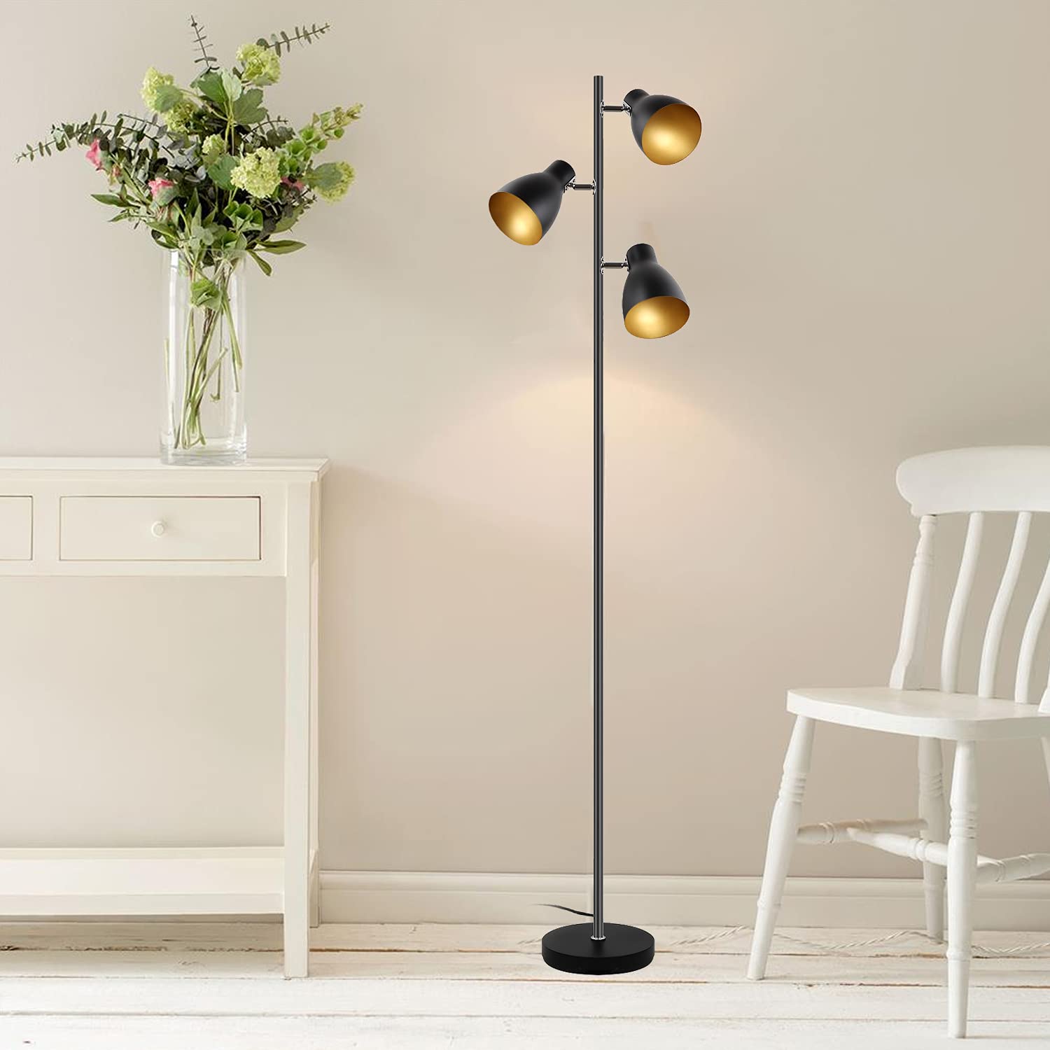 Lampa stojąca do czytania, z 3 regulowanymi obrotowymi lampkami, niezależne sterowanie, metal retro, czarno-złoty, E14, 168 cm, lampa stojąca do salonu i sypialni, biura, domu
