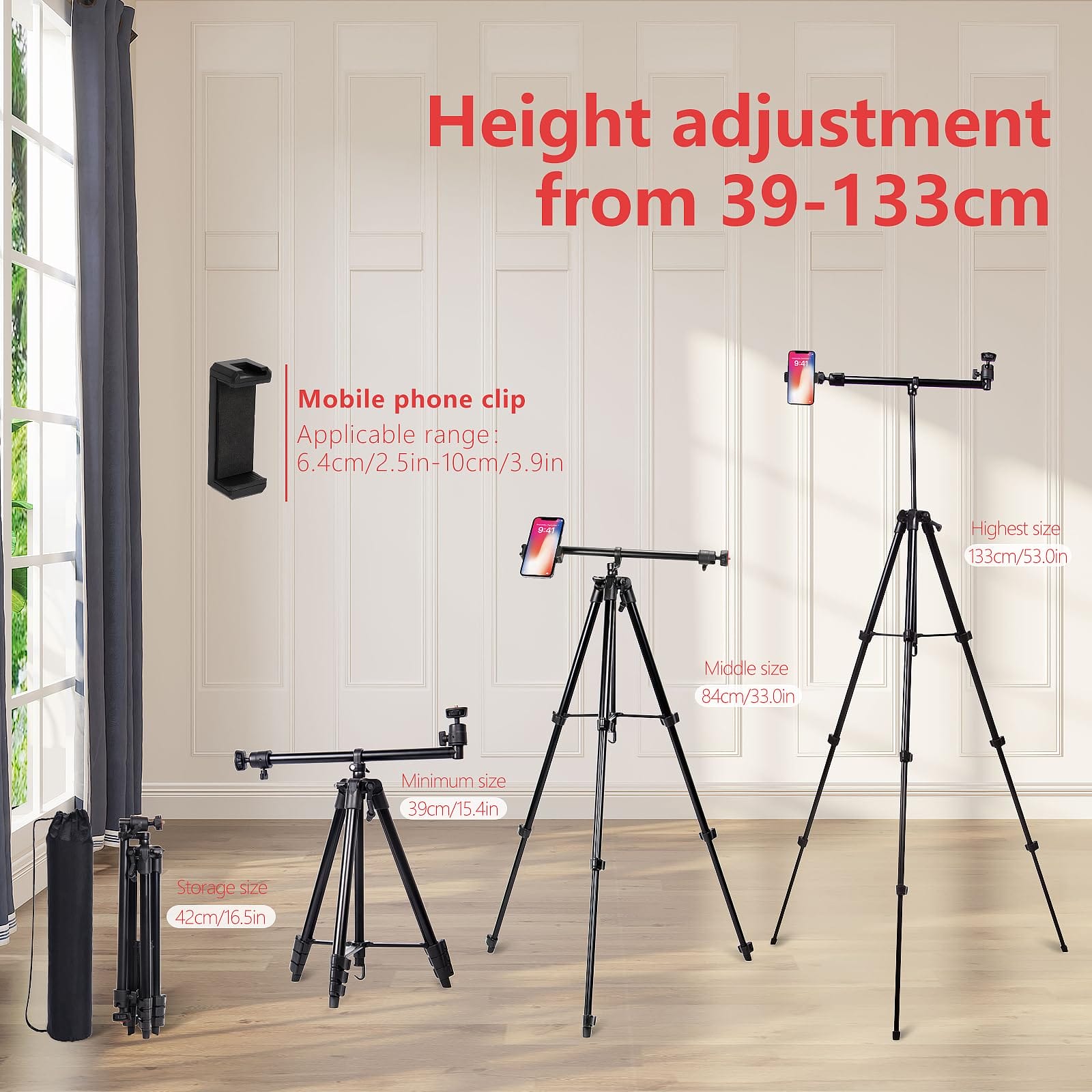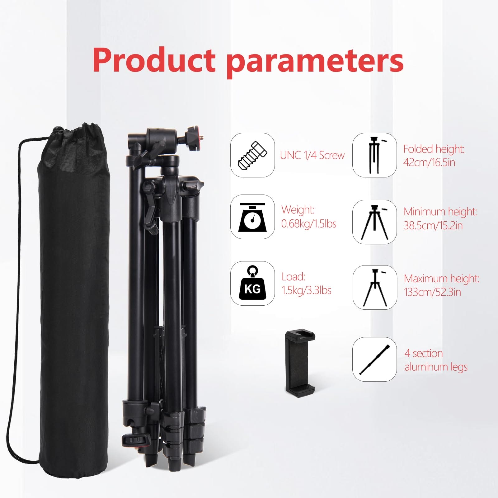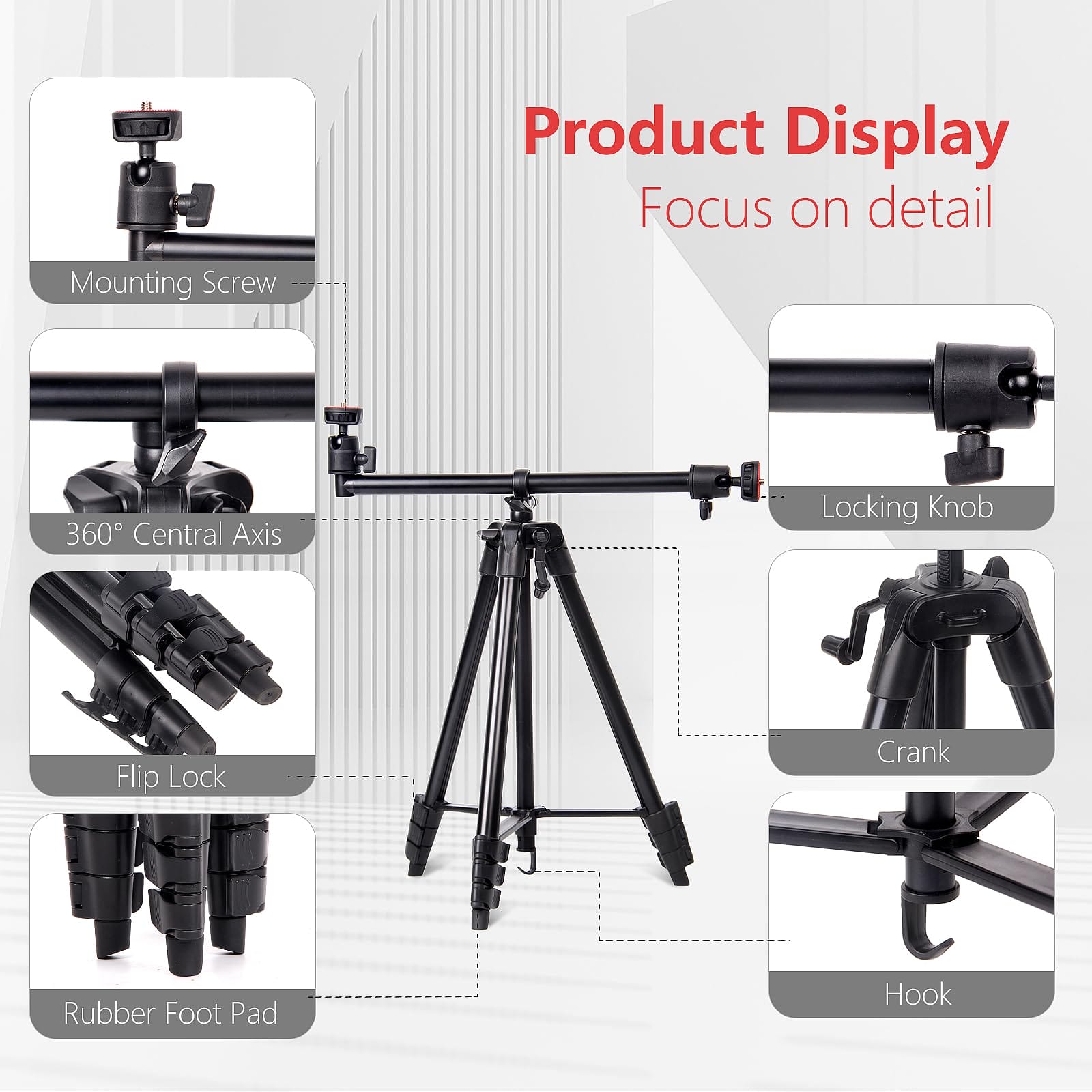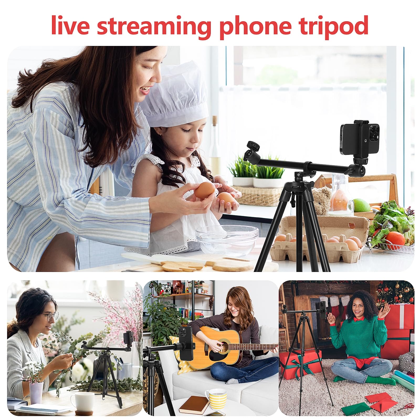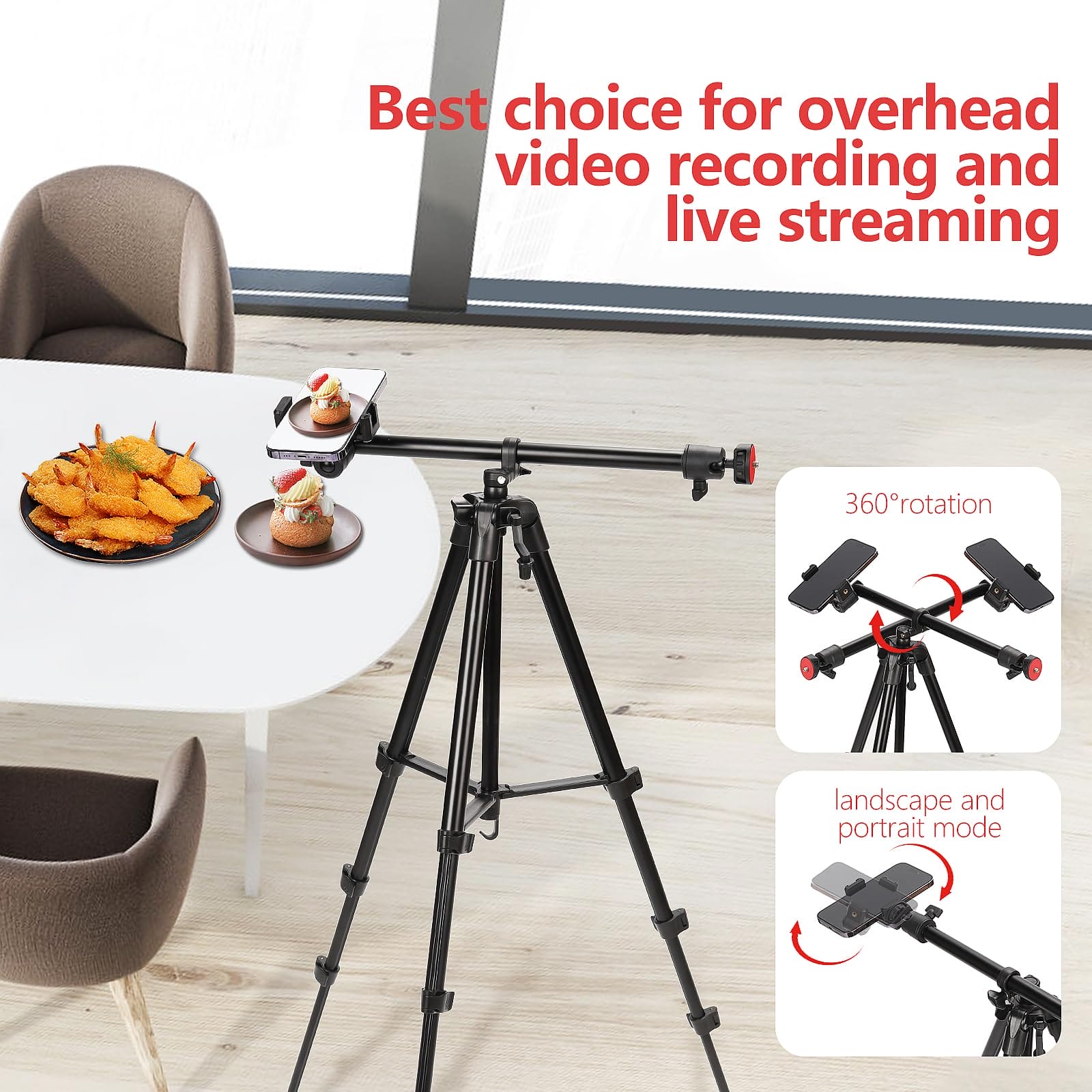 Overhead Tripod stojak na telefon 52″ to przenośny statyw aluminiowy, który jest idealnym narzędziem do robienia zdjęć, nagrywania wideo i streamingu na żywo. Ten kompleksowy statyw został zaprojektowany tak, aby zapewnić użytkownikom wygodę i stabilność podczas korzystania z telefonu komórkowego lub aparatu.
