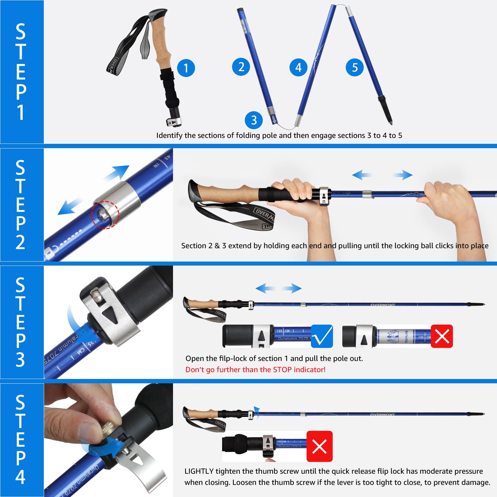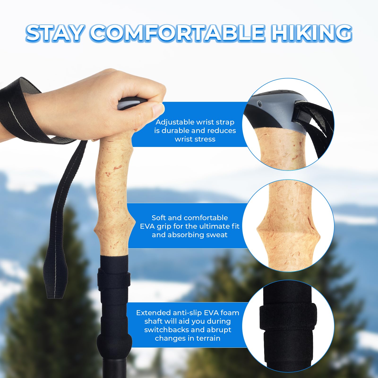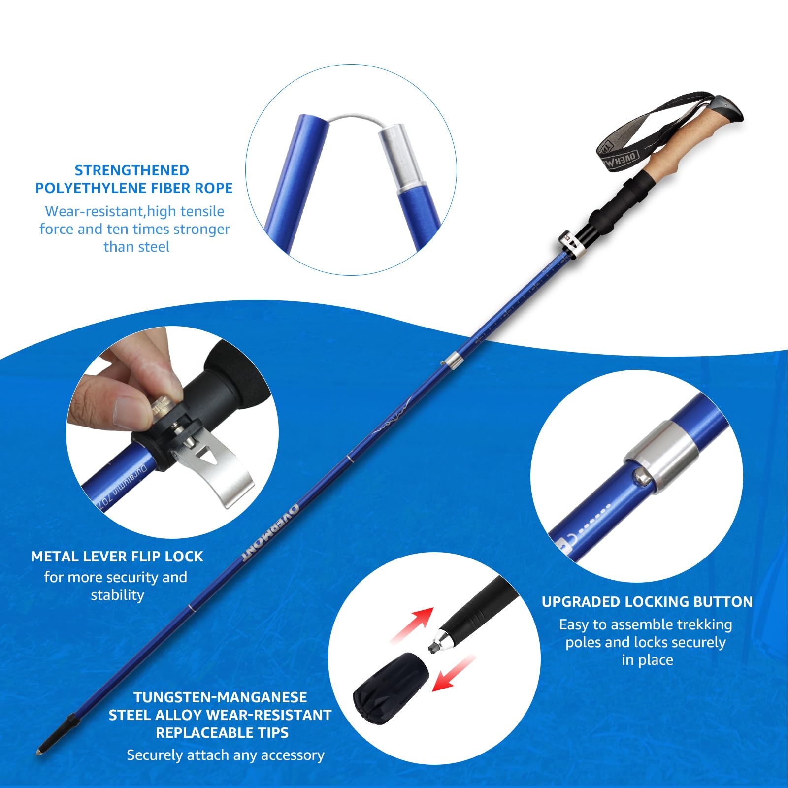 ✅ Ergonomiczne uchwyty EVA:: Ergonomiczne uchwyty EVA: zestaw kijków turystycznych Overmont został zaprojektowany z odprowadzającymi wilgoć uchwytami EVA. Formowanie do kształtu dłoni, antypoślizgowe i pochłaniające pot, bardziej wytrzymałe i wygodne niż korkowy uchwyt. Paski na nadgarstek są regulowane, mogą pozwolić ci lekko