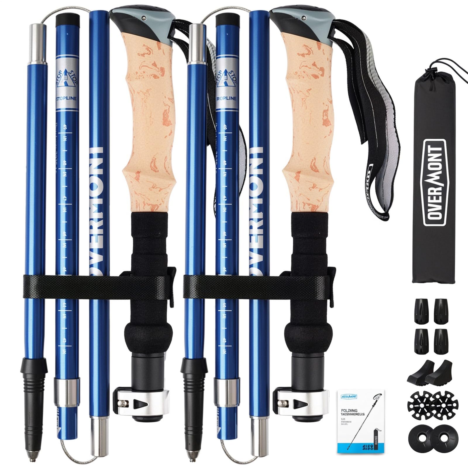 OVERMONT Kijki do chodzenia – 2-pak składanych aluminiowych kijków do chodzenia dla kobiet mężczyzn z systemem Quick Lock, aluminium 7075, składane, ultralekkie, do wędrówek, biwakowania, gór,