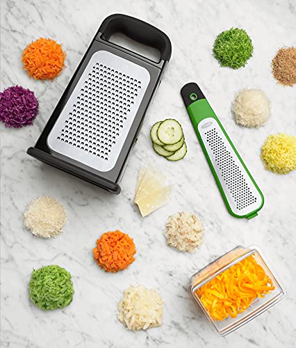 ✅ 4. strona ma: 4. strona ma ostrze zester, które może być używane na tarce lub można je odłączyć i używać niezależnie nad miską lub deską do krojenia