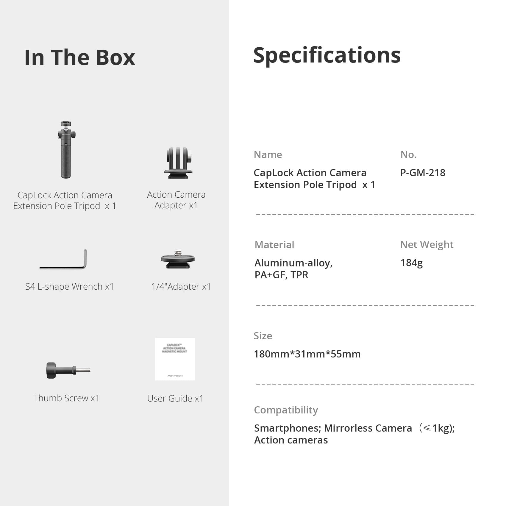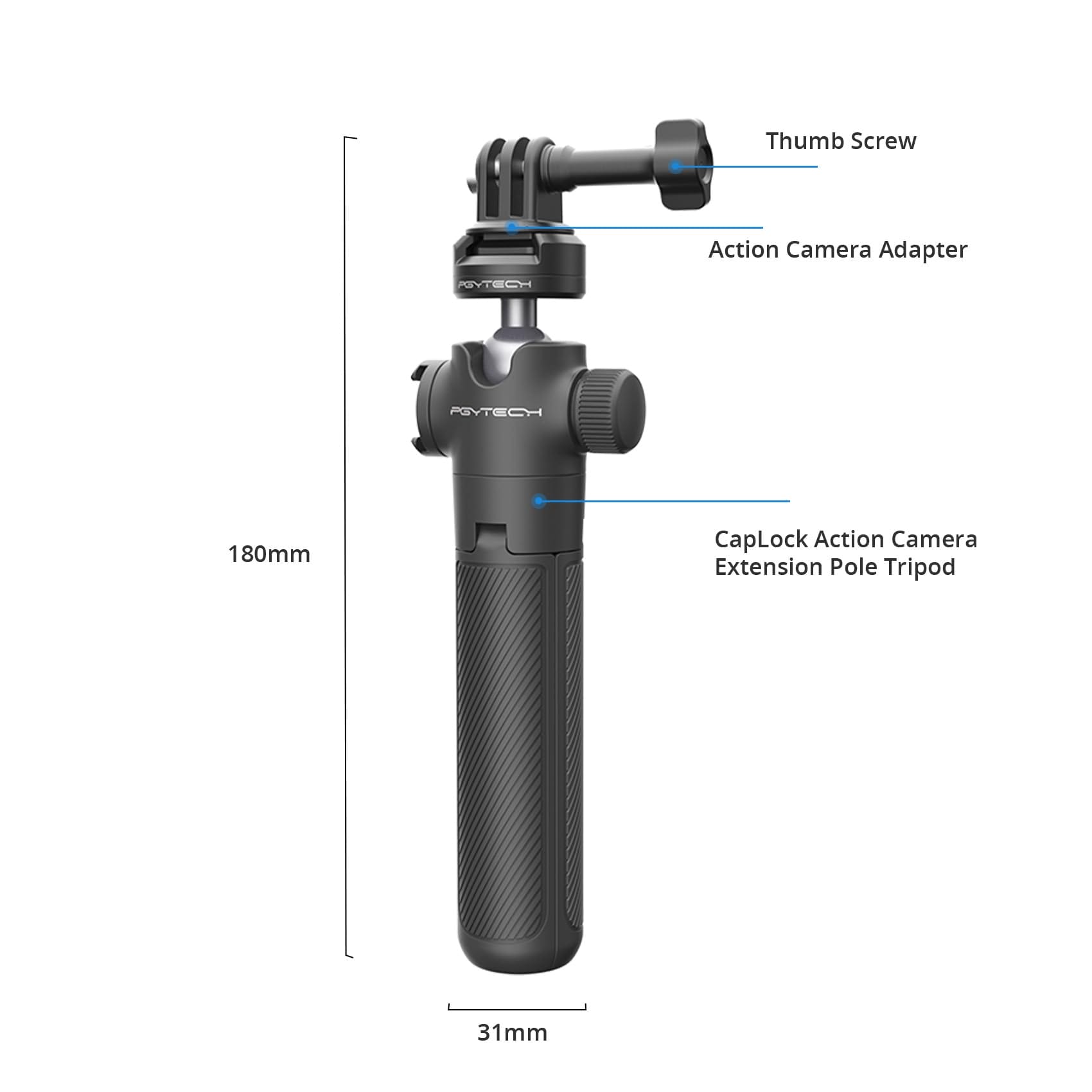 PGYTECH CapLock to statyw przedłużający mini statyw, który jest kompatybilny z kamerami OSMO Action 4/3/2, OSMO Pocket 2, GoPro 12/11/10/9, Insta360, XiaoYi i Feiyu. Ten produkt oferuje wiele funkcjonalności i cech, które sprawiają, że jest idealnym narzędziem dla każdego fotografa lub filmowca.