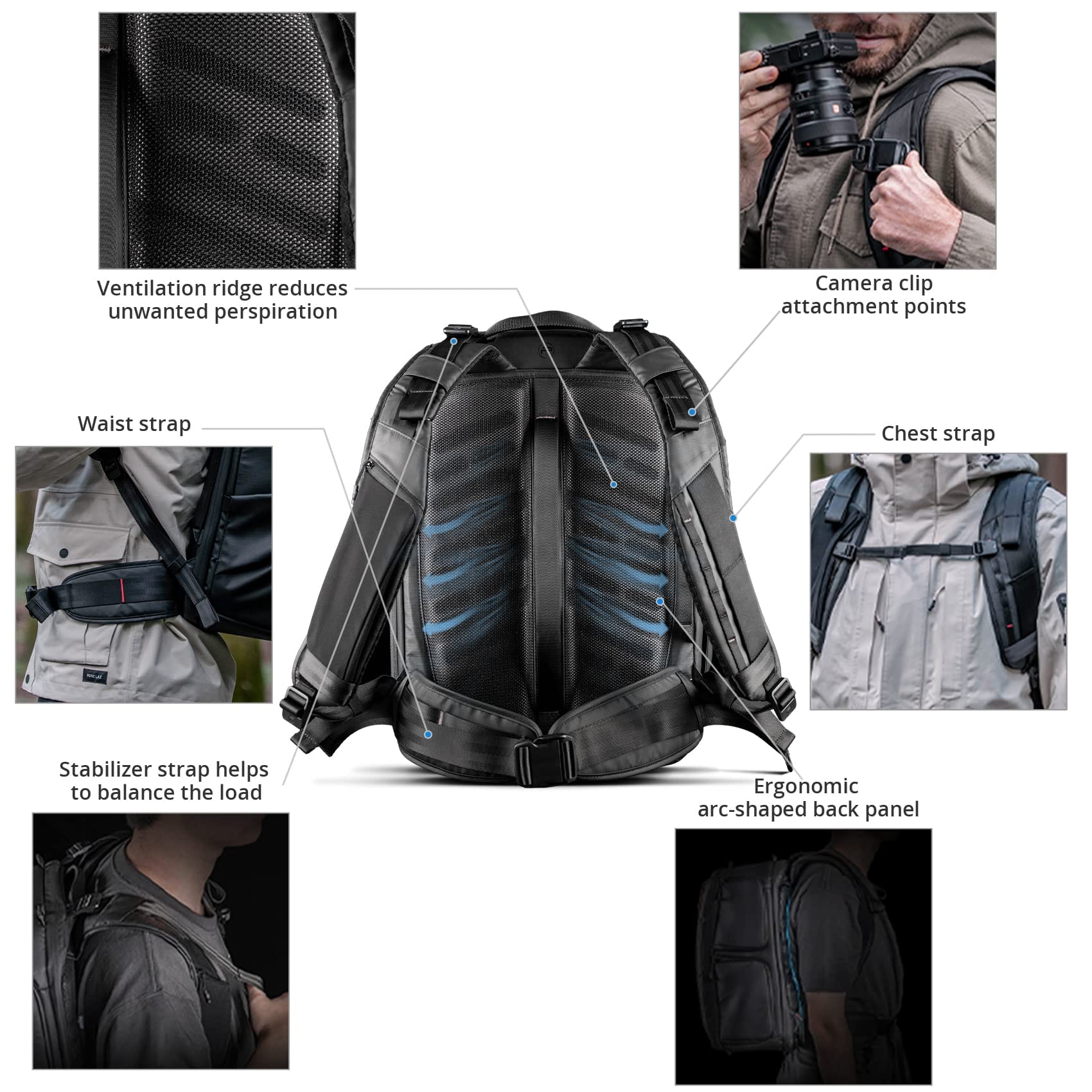 Plecak zapewnia również wyjątkowy komfort noszenia. Ergonomiczna konstrukcja pleców, szeroki i gruby pas biodrowy, s-fasonowe szelki i pas piersiowy zmniejszają nacisk na plecy i zapewniają oddychalność. Szelki są również wyposażone w kieszeń na smartfon.