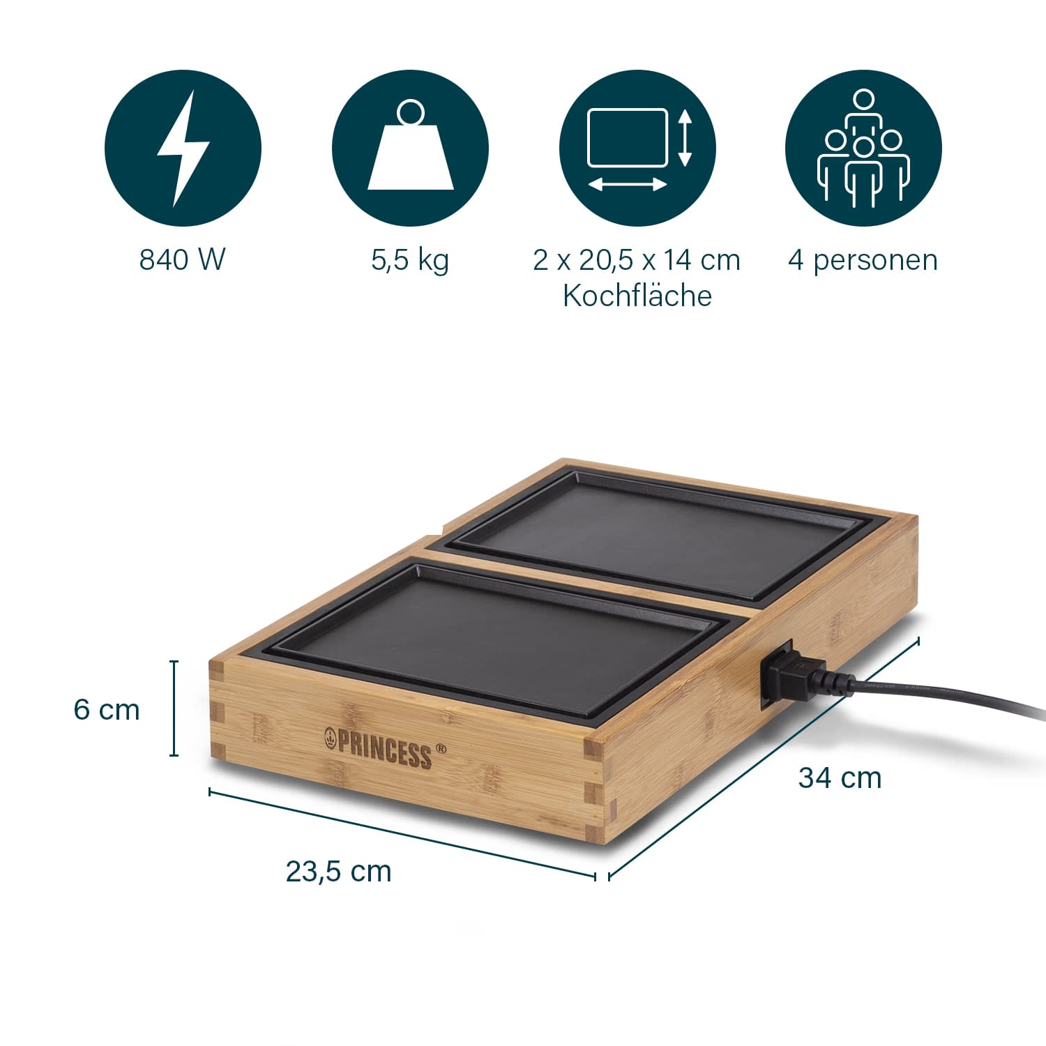 Grill stołowy Princess: Grill stołowy Princess Dinner4All Pure nadaje się dla 4 osób na towarzyską kolację, która zaspokoi smak całej rodziny. Jest wyposażona w 4 pojedyncze płyty grzewcze, każda o wymiarach 20,5 x 14 cm – Optymalne, jeśli Twoi goście cierpią na alergie lub muszą przestrzegać specjalnej diety