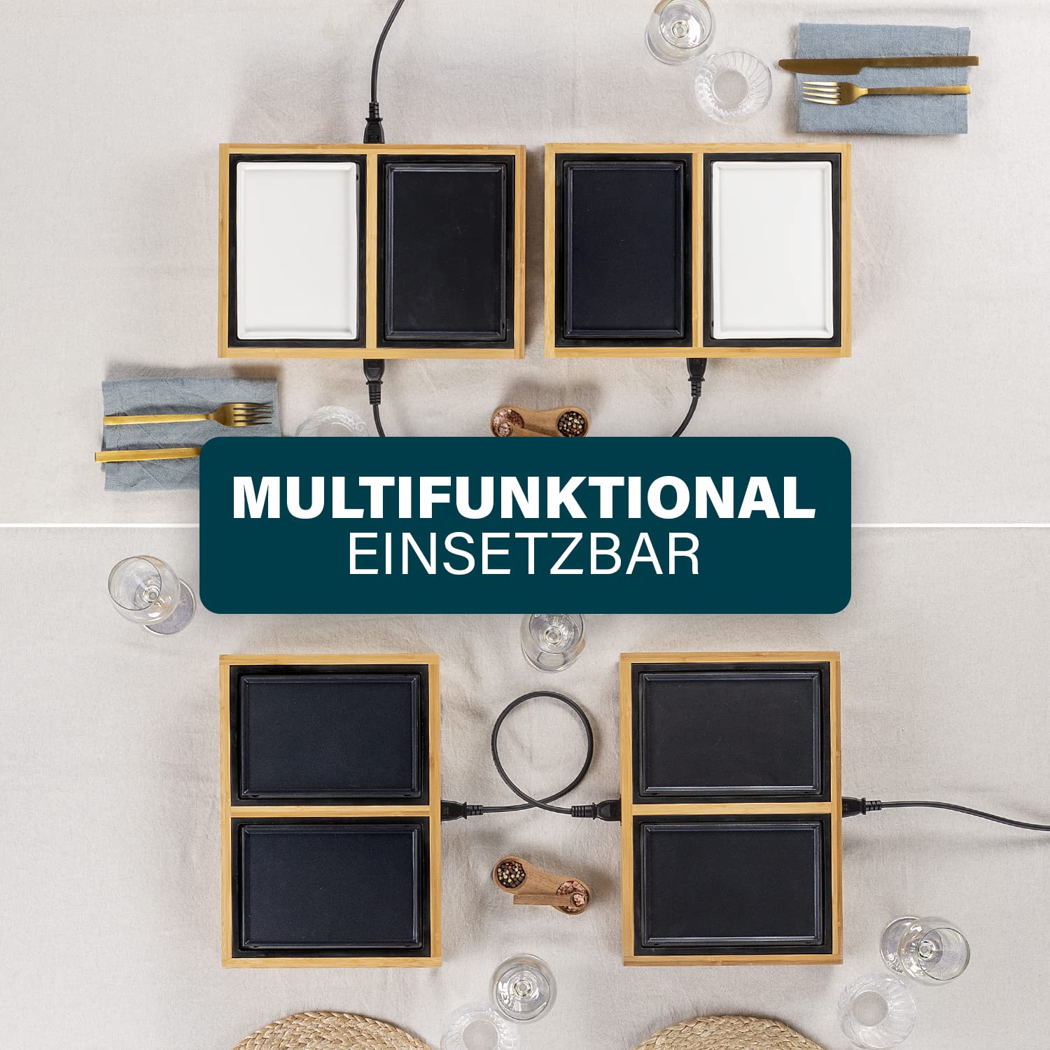 Grill stołowy Dinner4all: Grill stołowy Dinner4all Pure składa się z 4 płyt grzewczych z odlewu aluminiowego i 4 talerzy ceramicznych, które można zintegrować z podstawą. Ponieważ nie nagrzewają się, optymalnie nadają się do serwowania sosów lub surowych potraw