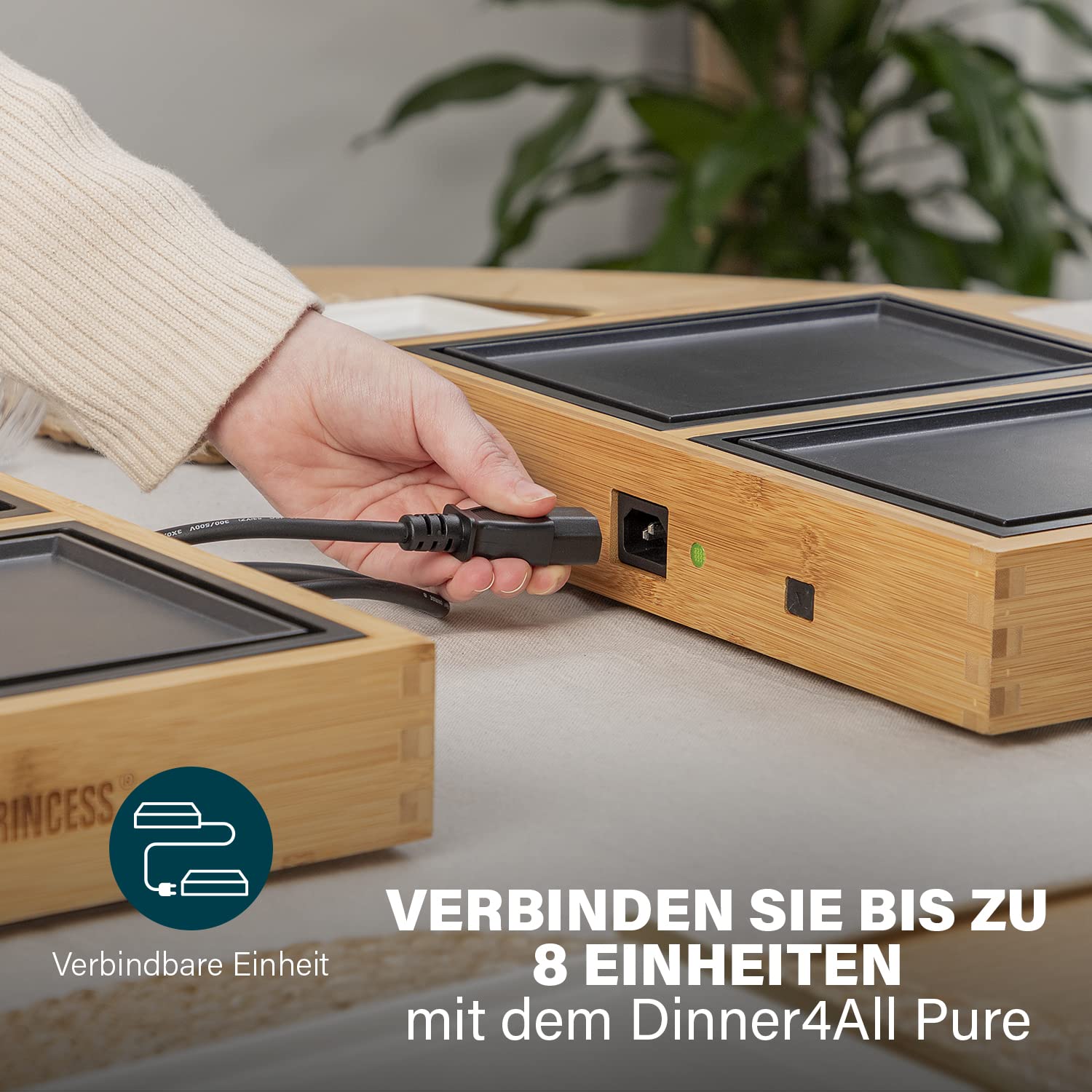 Princess 104040 Dinner4All Pure Grill Stołowy z Bambusową Obudową, Dla Maksymalnie 4 Osób, 4 Płyty Do Grillowania I 4 Półmiski, 4 X 210 W, Długość Kab