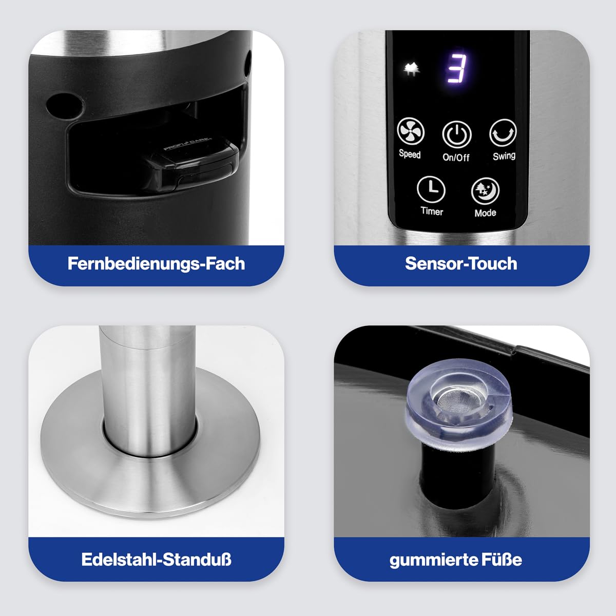 Wentylator ProfiCare PC-TVL 3090 oferuje **trzy poziomy prędkości**, co pozwala na dostosowanie intensywności nawiewu do indywidualnych potrzeb. Niezależnie od tego, czy potrzebujesz delikatnego powiewu, czy mocniejszego chłodzenia, ten wentylator sprosta Twoim oczekiwaniom.
