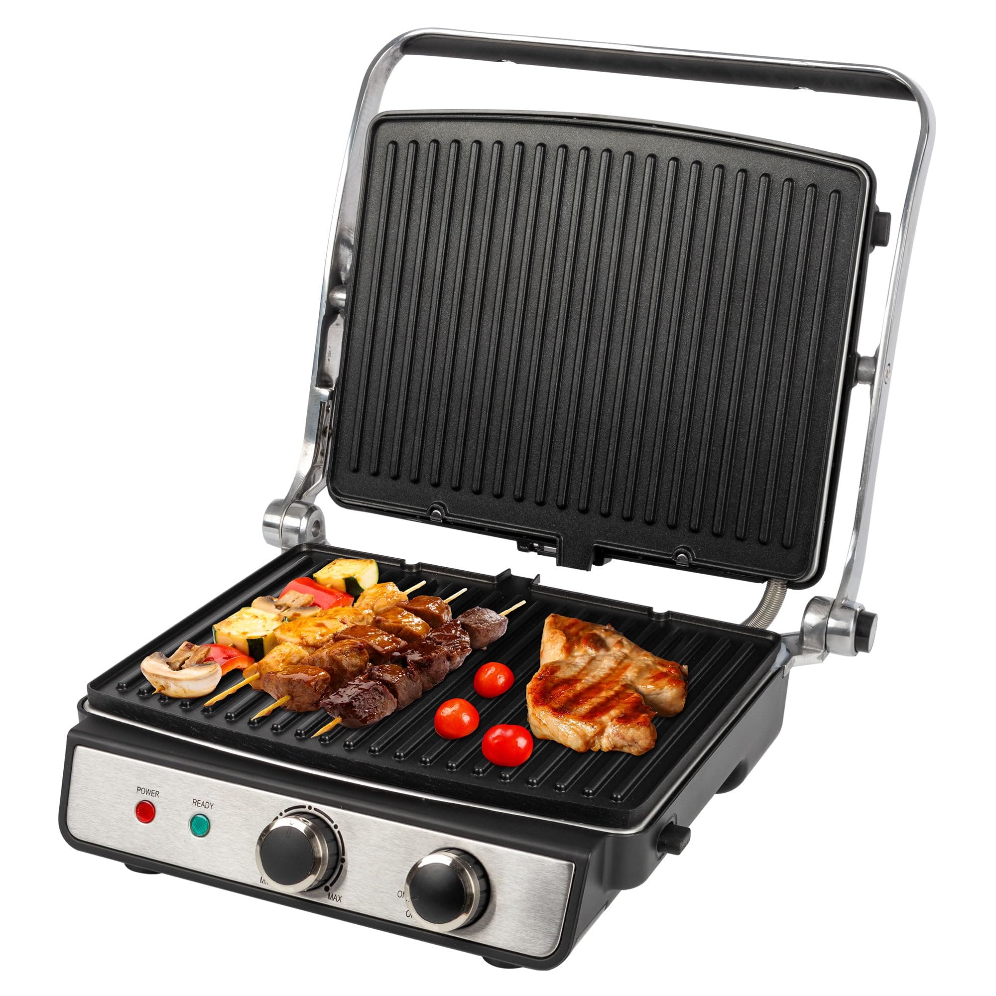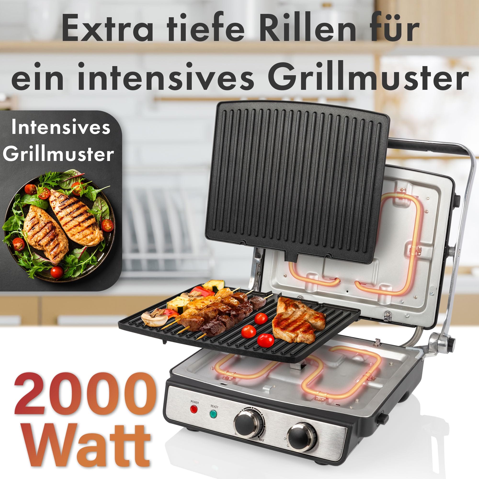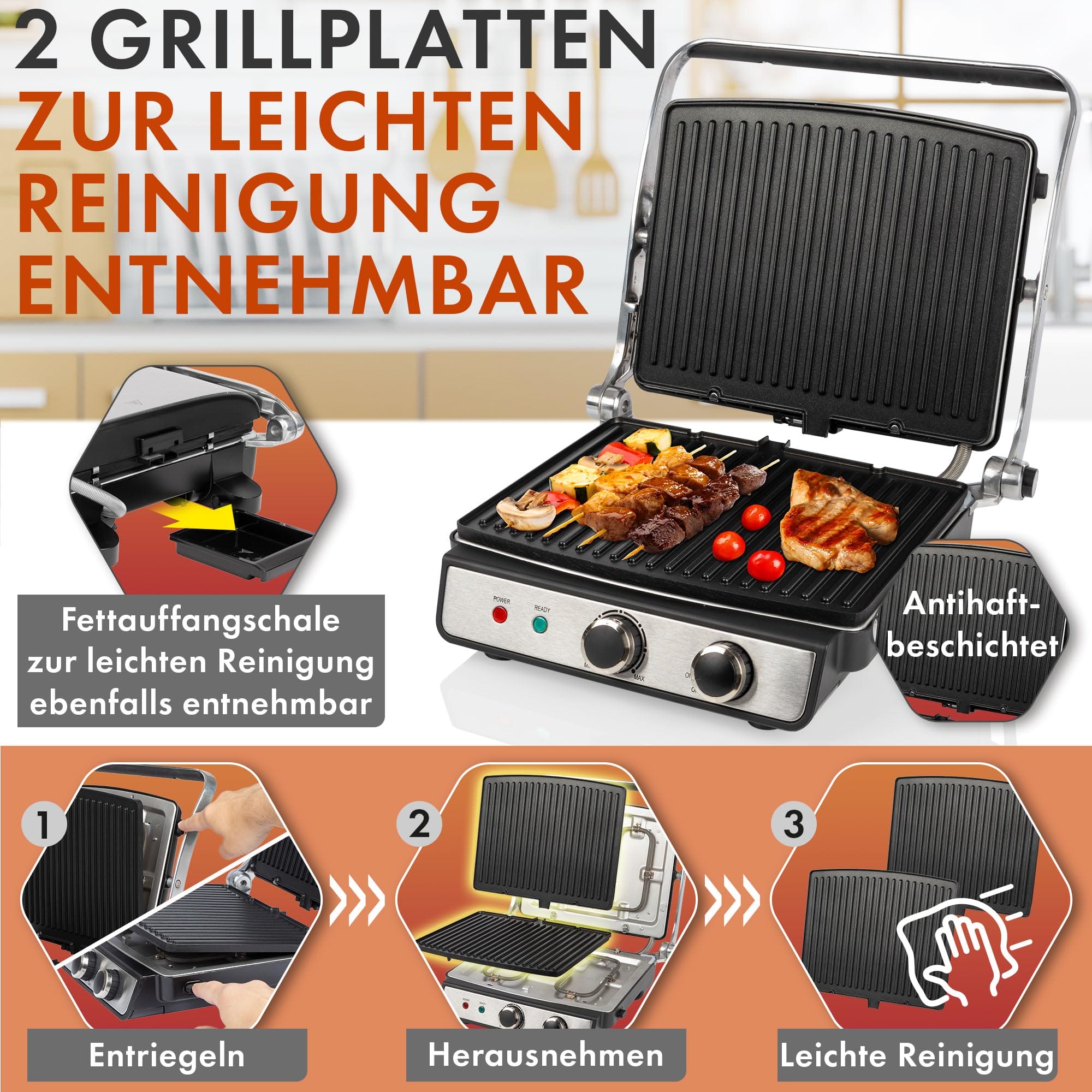 Einzelheiten: Kontaktgrill für beidseitiges, fettfreies Grillen Barbecue-Grill – 180° Öffnung ermöglicht das Grillen auf doppelter Fläche 2000 Watt Edelstahlgehäuse Zentrale Fettablaufrinne und Auffangschale (Schale zur leichten Reinigung entnehmbar) Stufenlos regelbarer Thermostat Kurze Garzeiten Antihaftbeschichtete Grillplatten mit extra tiefen Rillen für ein intensives Grillmuster und optimalen Fettabfluss Grillplatten zur leichten Reinigung entnehmbar Großer, wärmeisolierter Griff mit Soft Touch-Einlage Ein-/Ausschalter 2 Kontrollleuchten für Netz und Heizung Temperatur „Ready“-Anzeige Große Grillflächen: 23 x 29 cm Vielseitige Nutzung für z. B. Panini, Steaks, Fisch, Gemüse, Eier oder Süßspeisen 220–240 V, 50/60 Hz, 2000 W