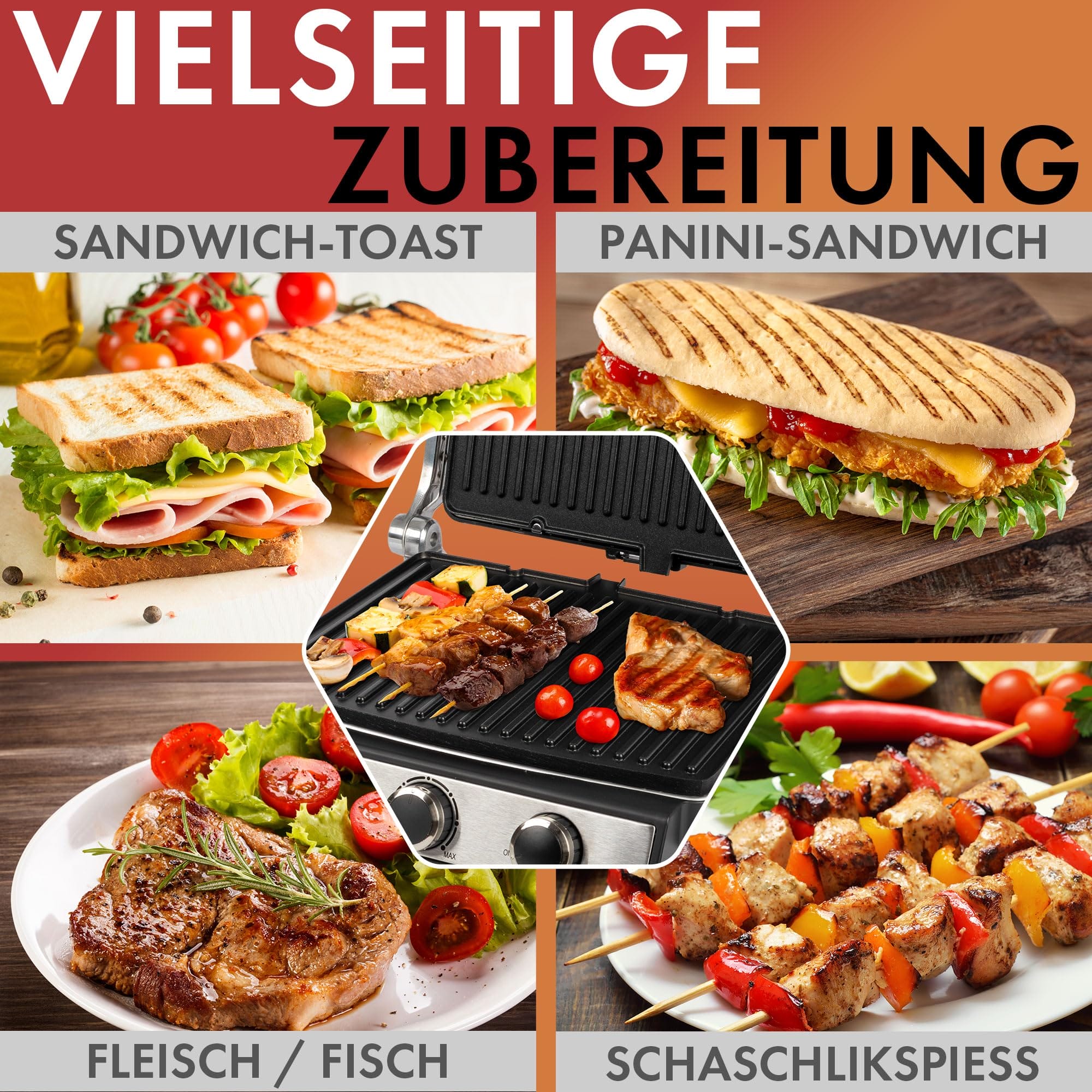 • Entdecken Sie den Geschmack von perfekt gegrilltem Essen mit dem Kontaktgrill XXL – saftig, fettfrei und unwiderstehlich dank 180° Barbecue-Grillfunktion