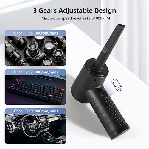 – 3 tryby prędkości wiatru: Ten odkurzacz posiada trzy tryby prędkości wiatru: 51000RPM, 71000RPM, 91000RPM. Aby go włączyć, należy przytrzymać przycisk przez 3 sekundy. Ustawienie domyślne to jedna prędkość. Krótkie naciśnięcie przycisku pozwala przełączać się między trzema prędkościami i czyszczeniem różnych urządzeń.