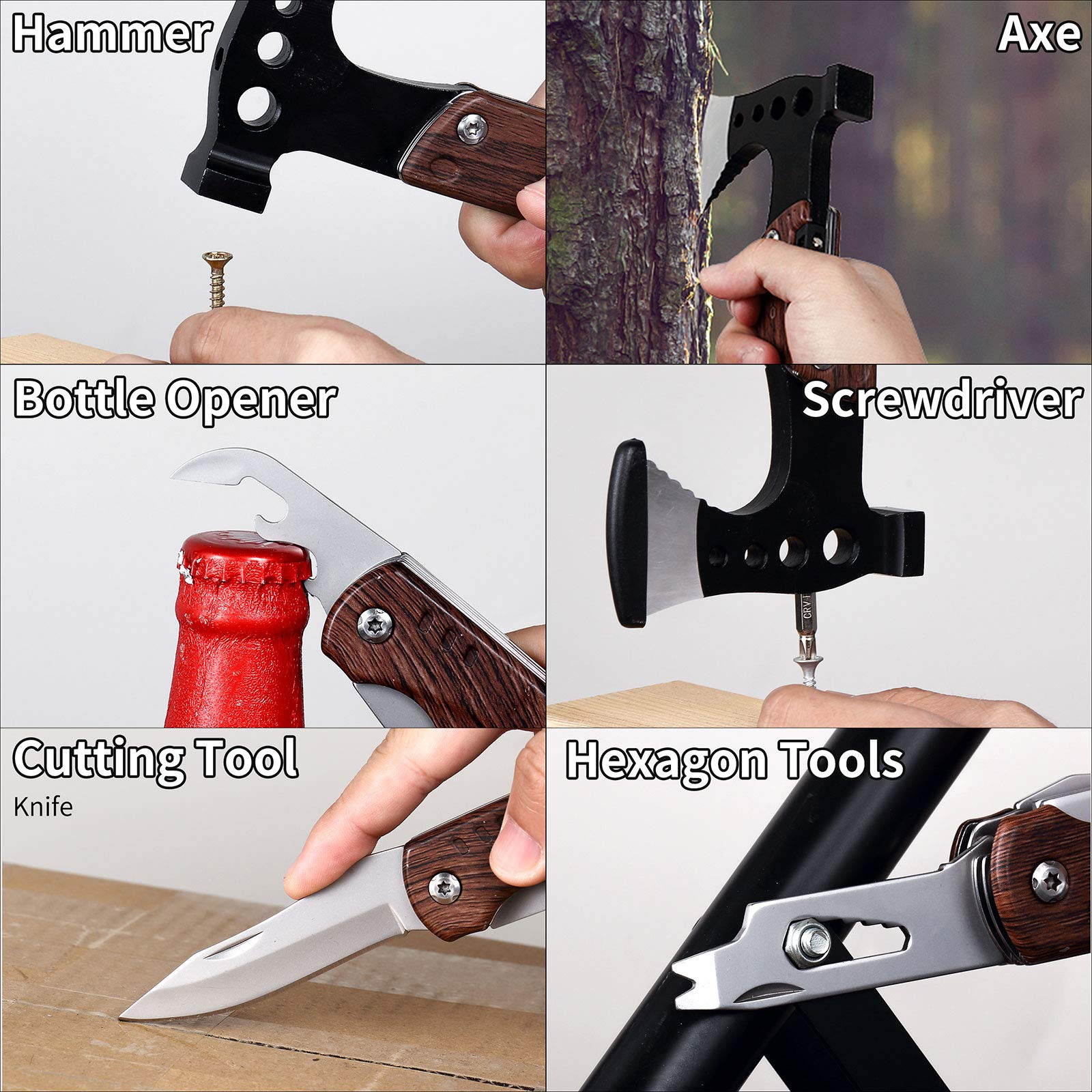 8 w 1: 8 w 1 MULTITOOL SIEKIERA: 8 funkcji w jednym, sprawia, że przygody na świeżym powietrzu są łatwiejsze i przyjemniejsze. Zawiera siekierę, młotek, grupę bitów, adapter do bitów, śrubokręt płaski i pilnik, otwieracz do butelek i otwieracz do puszek, klucz imbusowy, wybijak do gwoździ i nóż.
