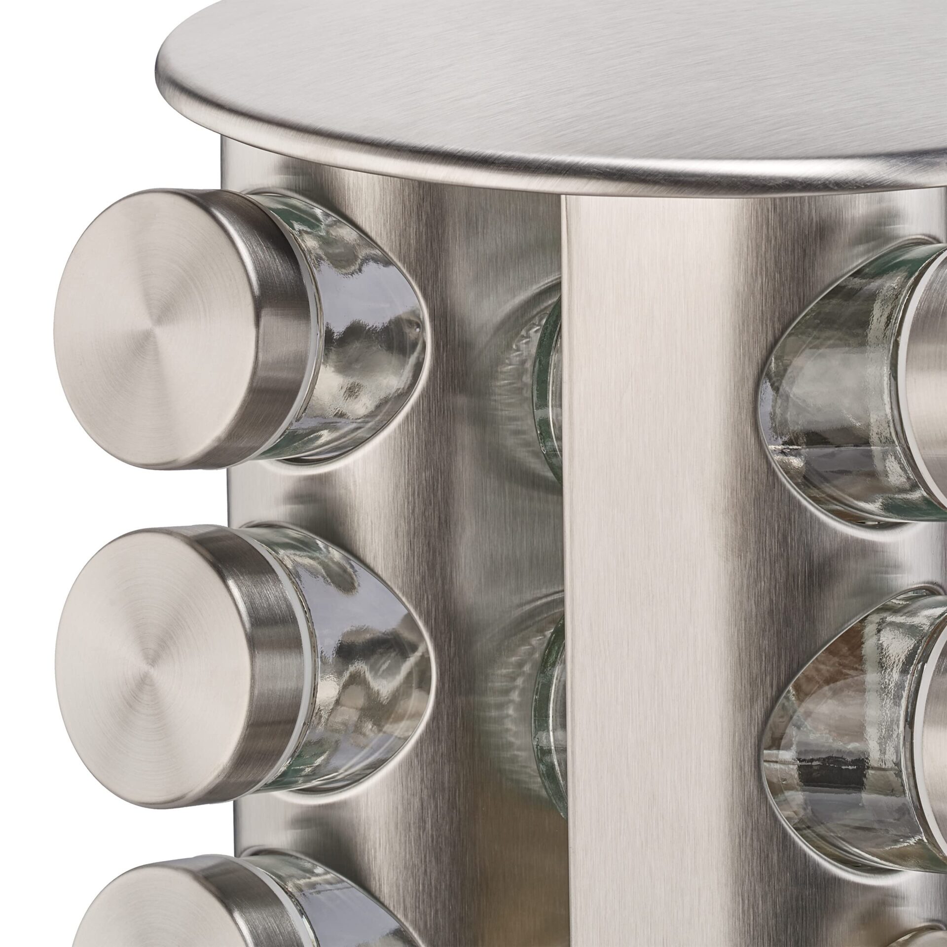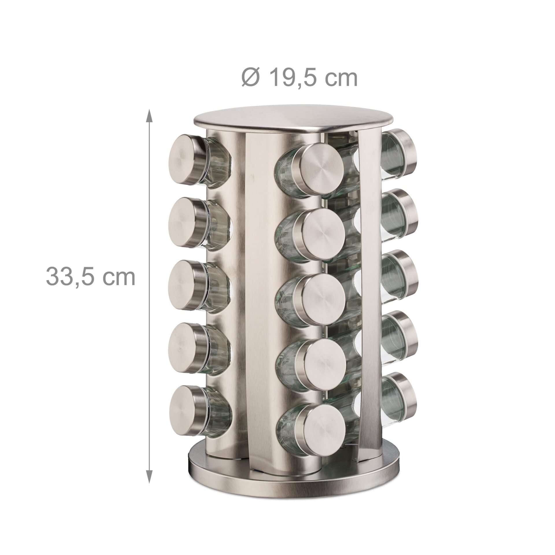 Wymiary karuzeli wynoszą około 33,5 x 19,5 cm, co czyni ją idealnym rozwiązaniem do każdej kuchni, niezależnie od jej rozmiaru. Stalowa konstrukcja zapewnia stabilność i trwałość, dzięki czemu zestaw będzie służył przez długi czas. Nowoczesny wygląd sprawia, że karuzela na przyprawy może być też efektownym elementem dekoracyjnym na blacie.